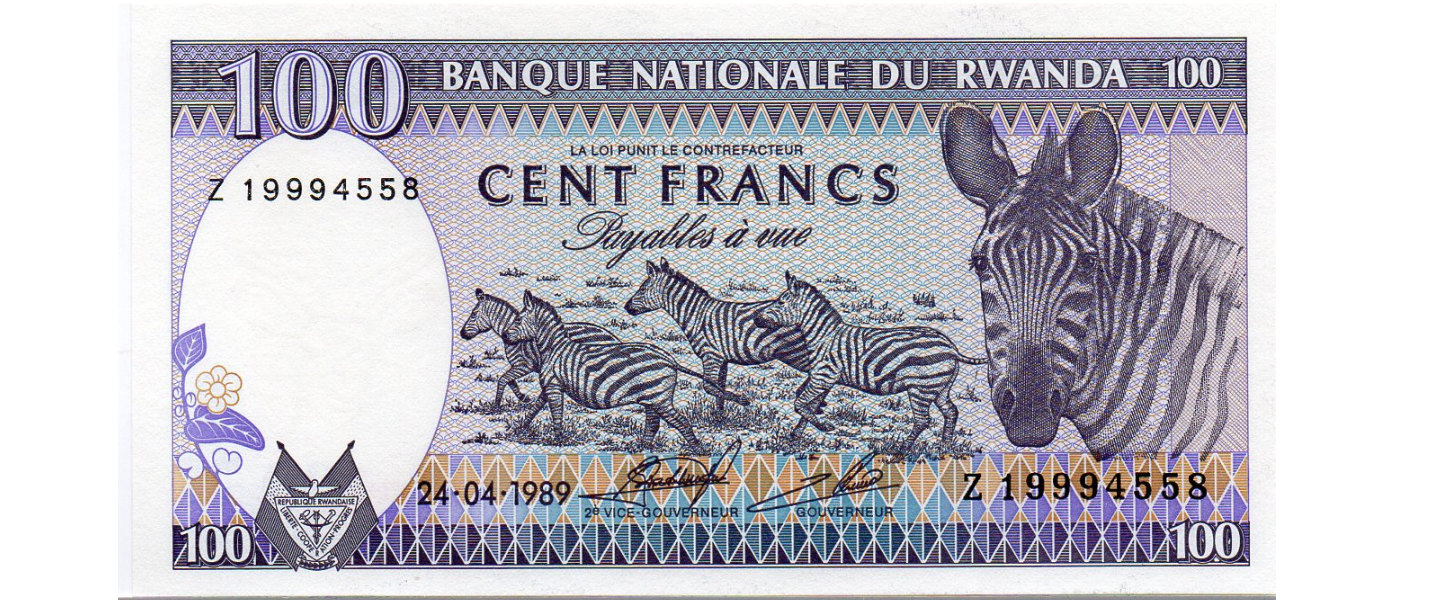 100 Francos / Amafaranga, 24.04.1989, SIN CIRCULAR (UNC), anverso: Cebras, reverso: Volcanes Mujer, Bebé, montes Karisimbi y Visoke (Cordillera del Volcán Virunga).