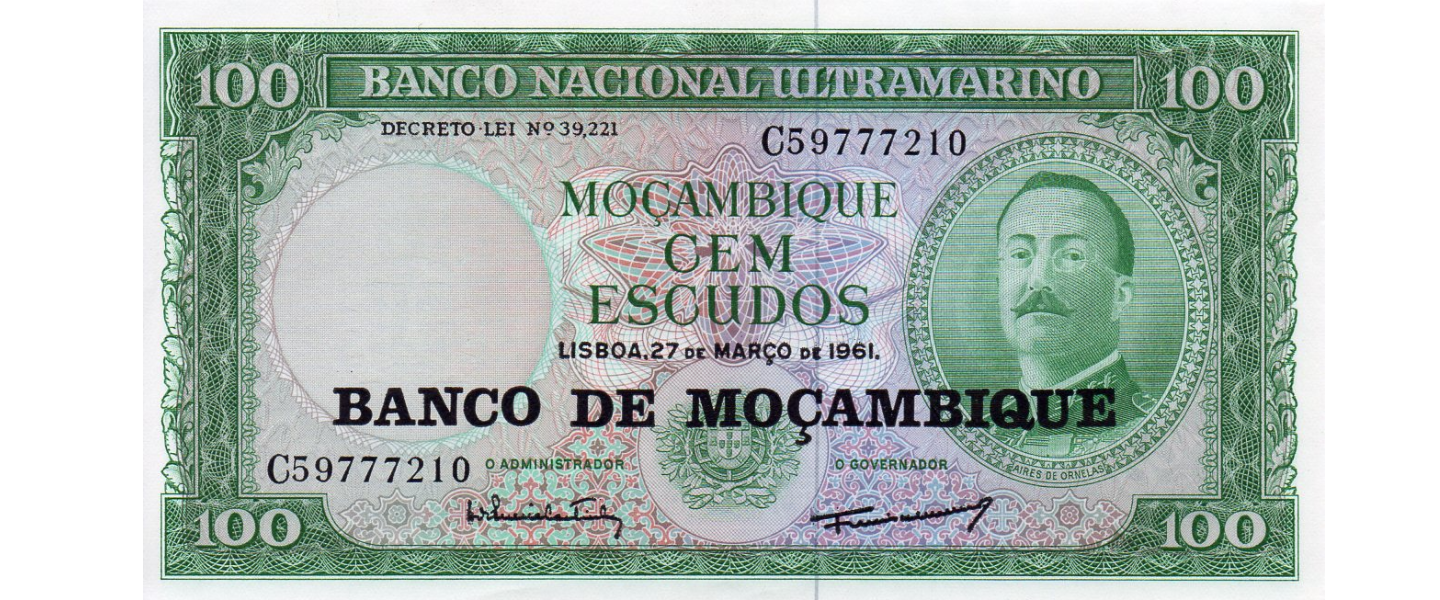 100 Escudos, 27.03.1961 (1976), P-117a, SIN CIRCULAR (UNC), resello sobre MOZAMBIQUE P-109, Aires de Ornelas.