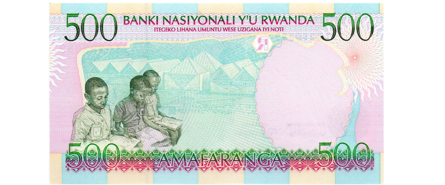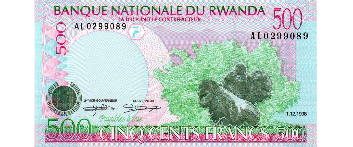 500 Francos / Amafaranga, 1989, SIN CIRCULAR (UNC), número de serie estrecho en la parte superior izquierda. Anverso: Gorilas, reverso: Chicos, Museo Nacional de Ruanda.