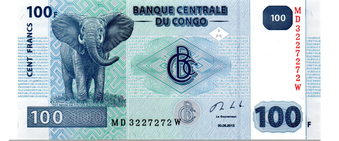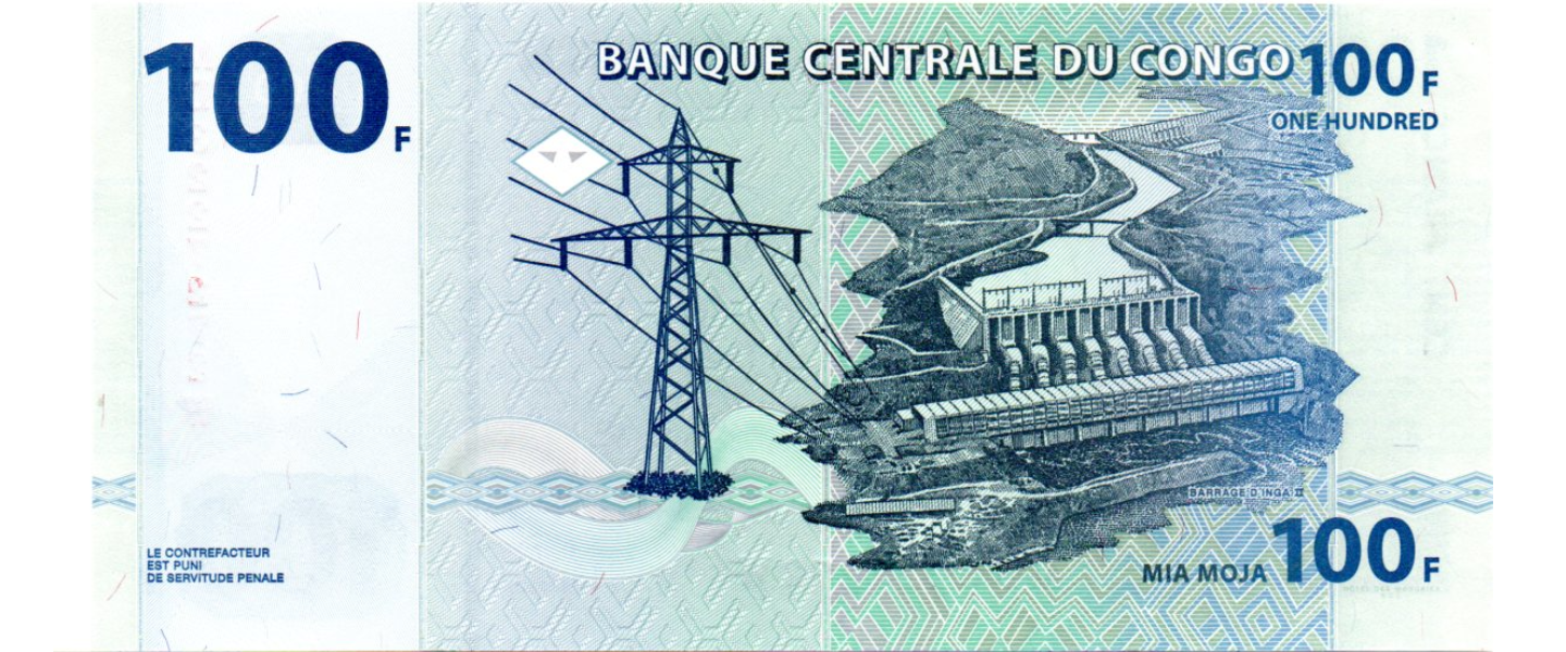 100 Francos, 30.06.2013, P-98b, SIN CIRCULAR (UNC), Impresor: Hôtel des Monnaies, Kinshasa (en la parte inferior derecha del reverso - difícilmente visible), Elefante, Parque Nacional Virunga, "Inga II" presa hidroeléctrica.