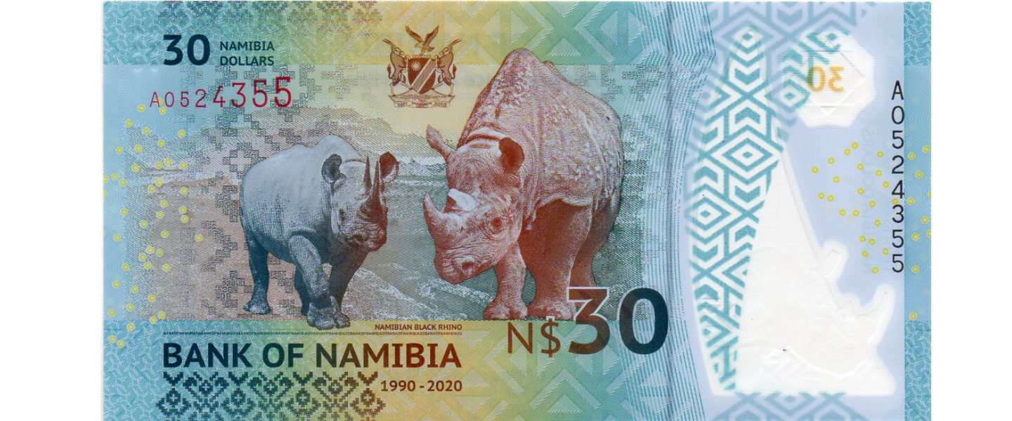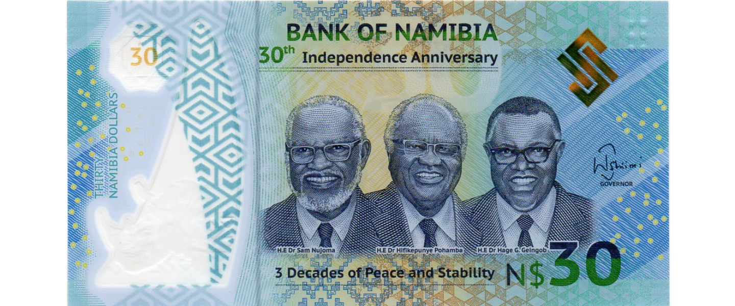 30 Dólares,2020, SIN CIRCULAR (UNC), material polímero, Aniversario 30 de la Independencia (1990-2020) / 3 Décadas de paz y estabilidad , Presidentes Dr. Sam Nujoma, Dr. Hifikepunye Lucas Pohamba, Dr. Hage G. Geingob, Rinocerontes, escudo de armas.