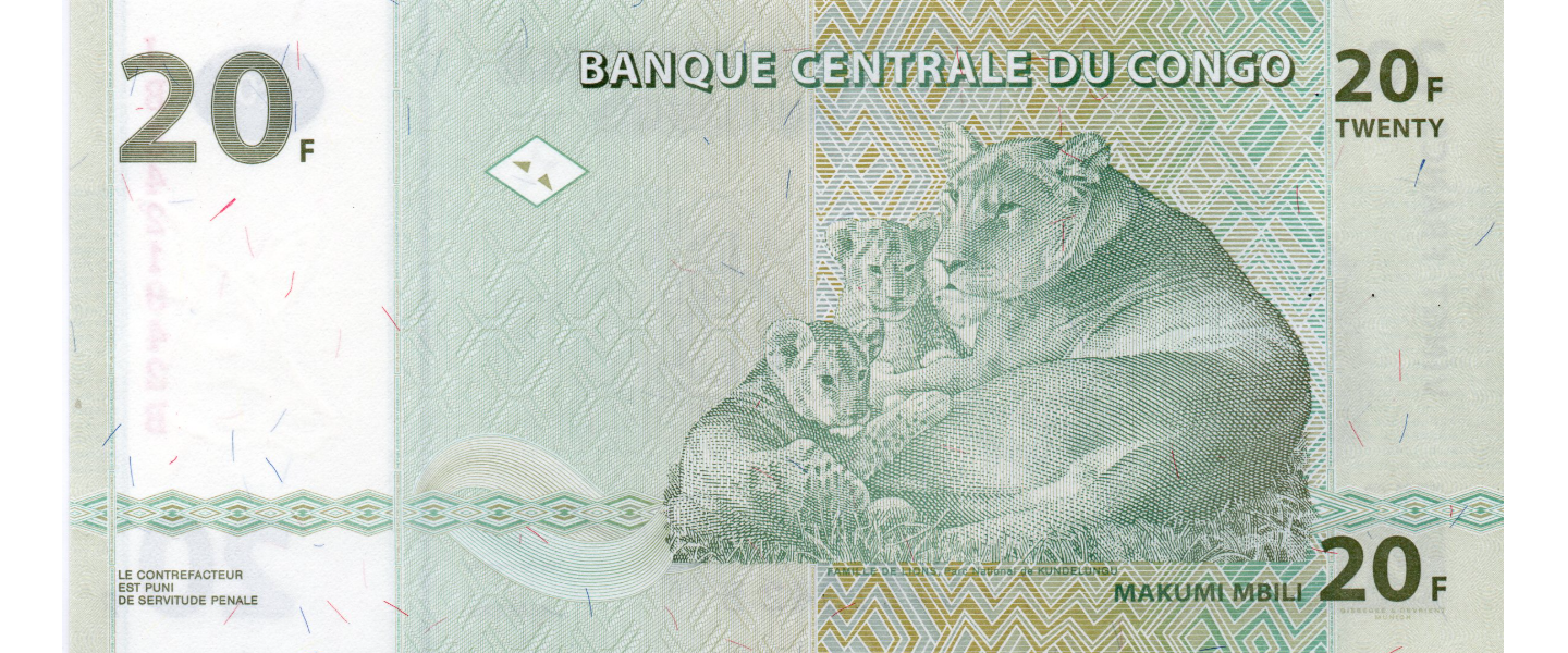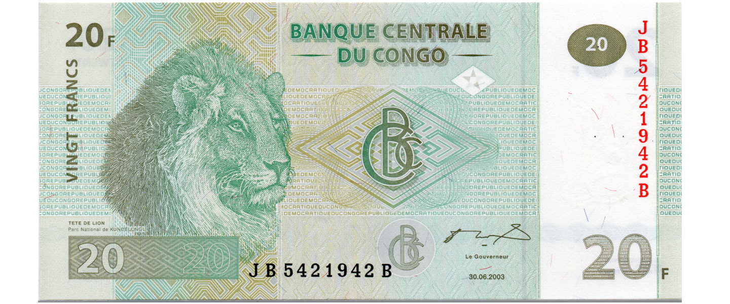 20 Francos, 30.06.2003, P-94a, SIN CIRCULAR (UNC), impresor: Giesecke & Devrient, Alemania (en la parte inferior derecha del reverso, apenas visible); reverso: Familia de leones, Parque Kundelongu.