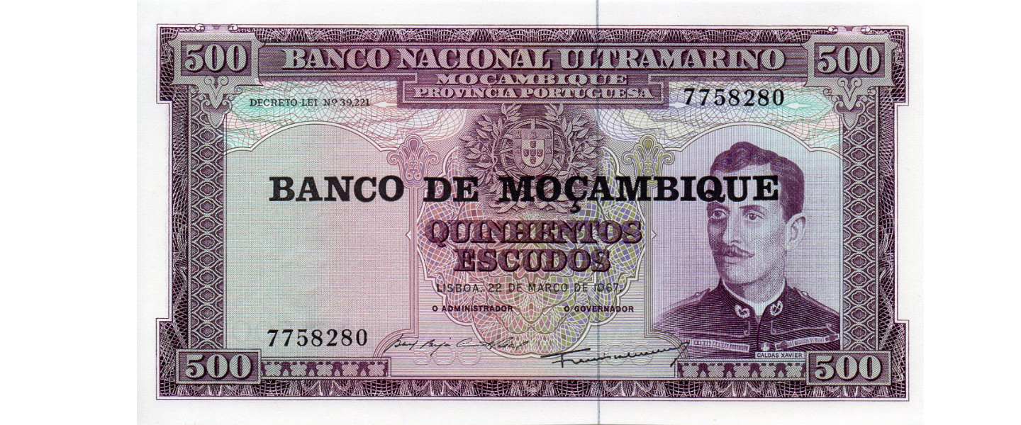 500 Escudos, 22.03.1967 (1976), SIN CIRCULAR (UNC), resello sobre MOZAMBIQUE P-110, Caldas Xavier, escudo de armas.