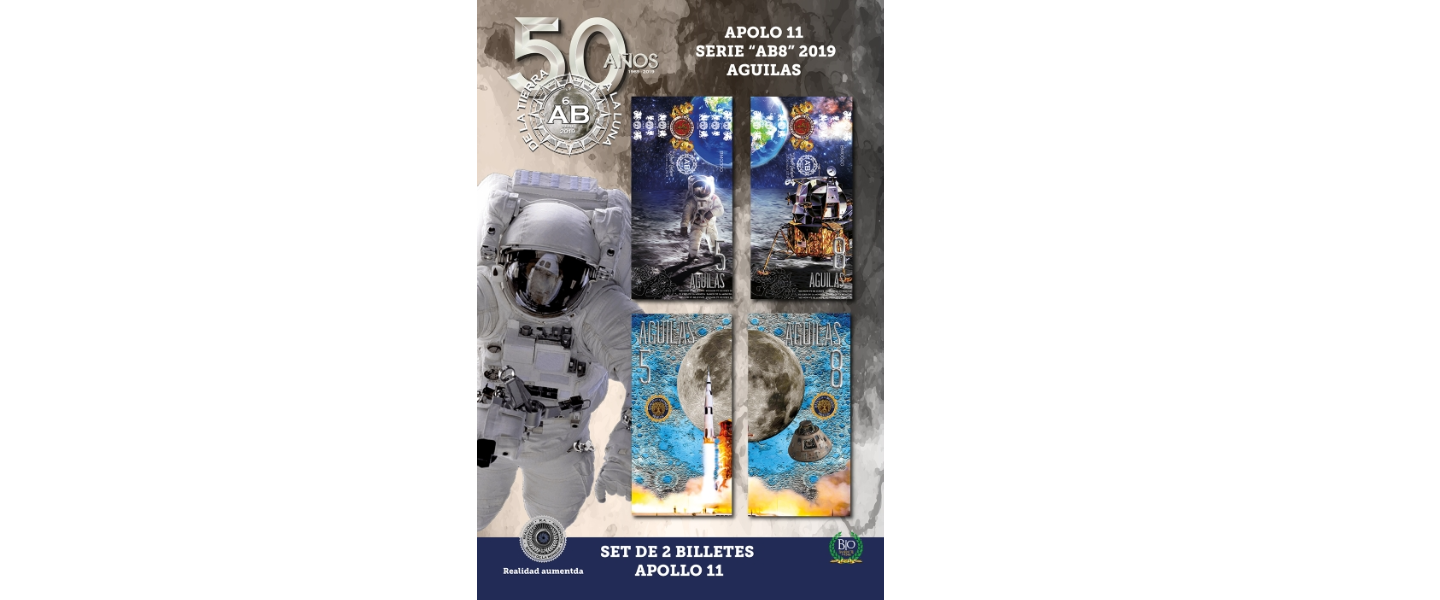 Set de dos (2) billetes APOLO 11 CINCUENTA AÑOS, elaborados por Banco de la Moneda, Medellín. Denominaciones de 5 y 8 águilas, poseen realidad aumentada.