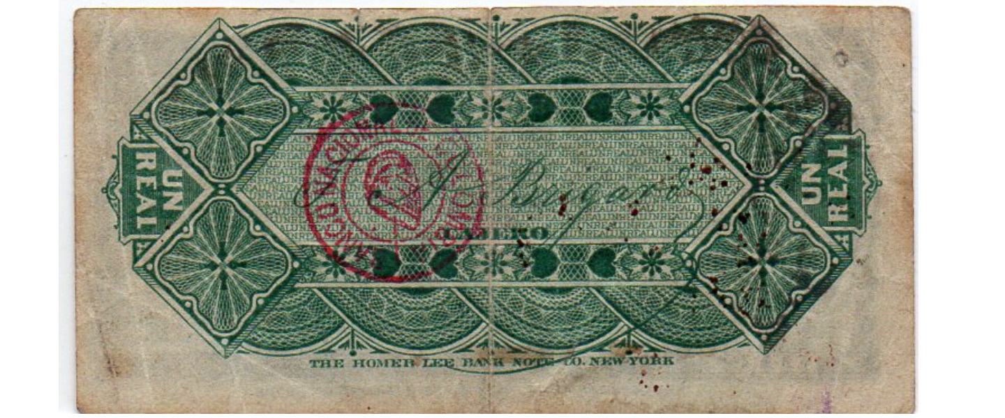 Banco Nacional, 10 Centavos 5 de agosto de 1885 serie N, FINO (F). Denominación equivalente a 1 real para la época, impresor The Homer Lee Bank Note Co. New York.