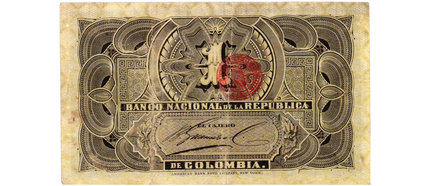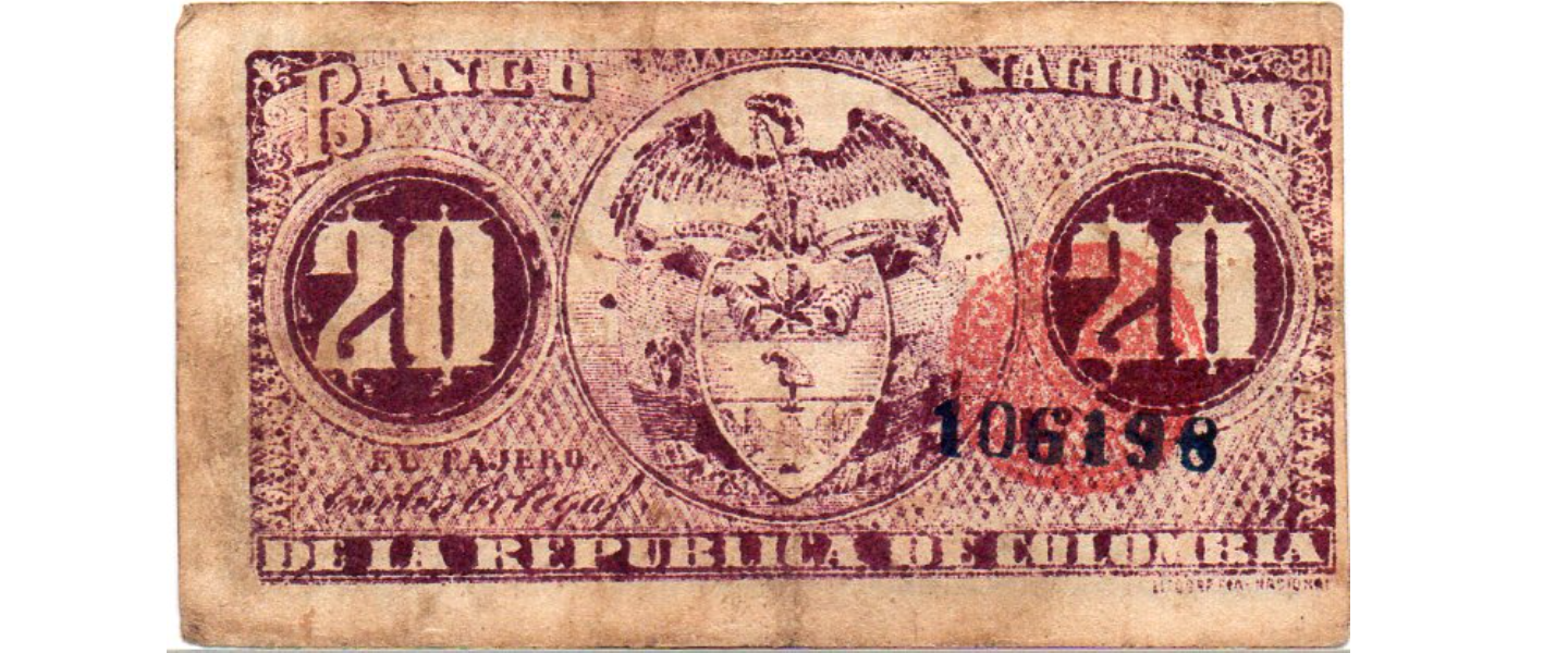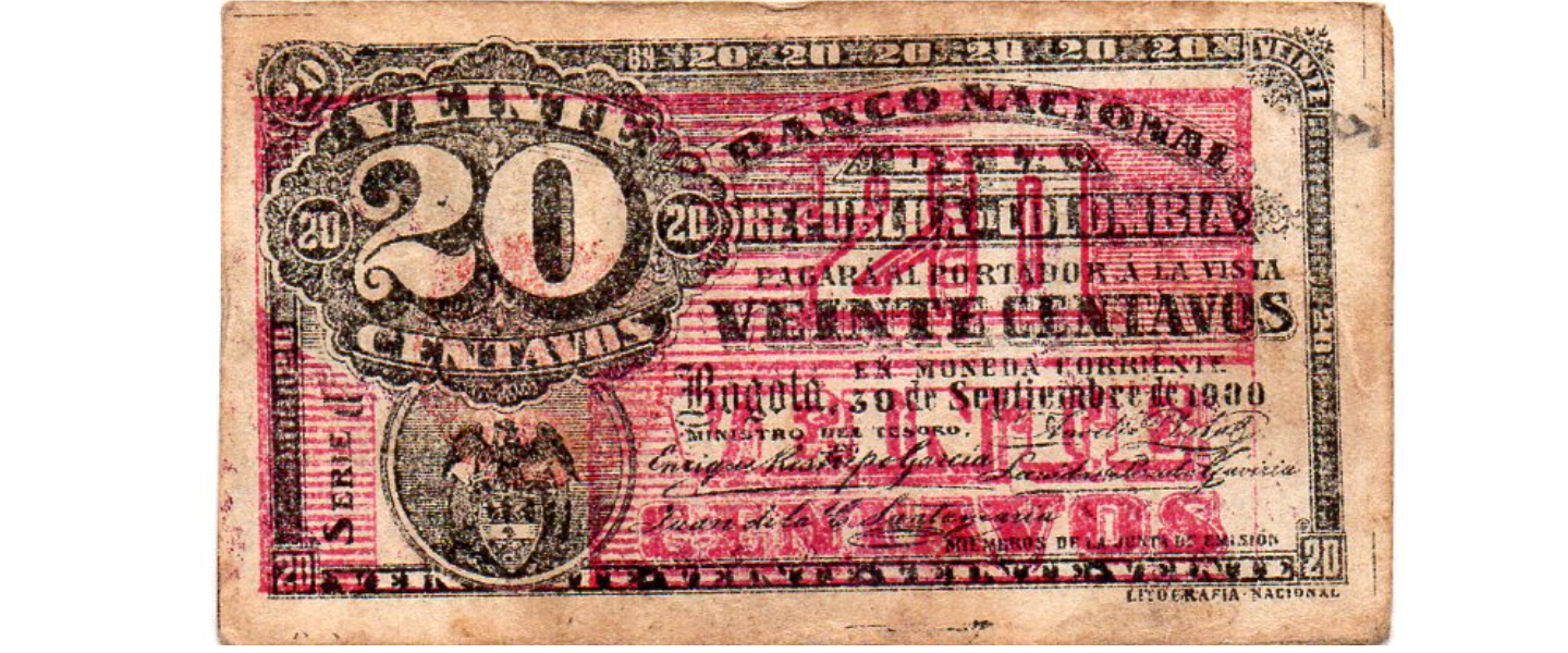 Banco Nacional, 20 Centavos 30 de septiembre de 1900, FINO (F). Impresor: Litografía Nacional, son así rústicos pues Colombia estaba viviendo la "Guerra de los Mil Días".