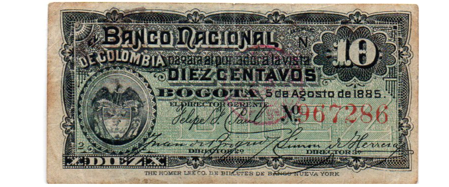 Colombia, Banco Nacional, 10 centavos 1885 serie N, F.