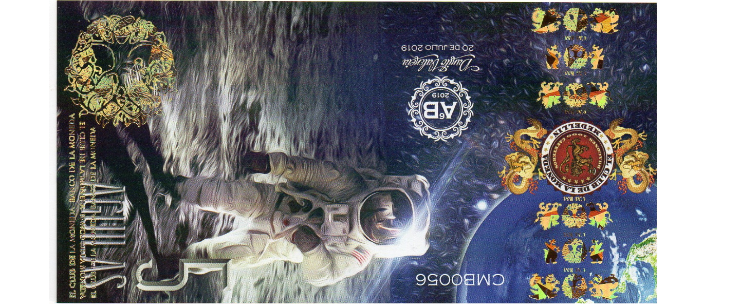 Set de dos (2) billetes APOLO 11 CINCUENTA AÑOS, elaborados por Banco de la Moneda, Medellín. Denominaciones de 5 y 8 águilas, poseen realidad aumentada.