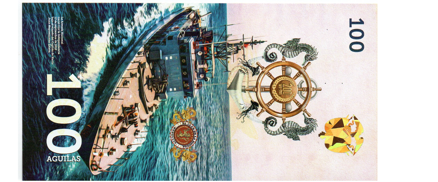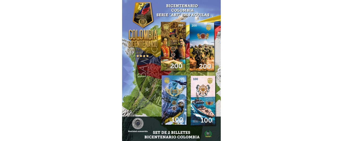 Set de dos (2) billetes BICENTENARIO COLOMBIA, elaborados por Banco de la Moneda, Medellín. Denominaciones de 100 y 200 águilas, poseen realidad aumentada.
