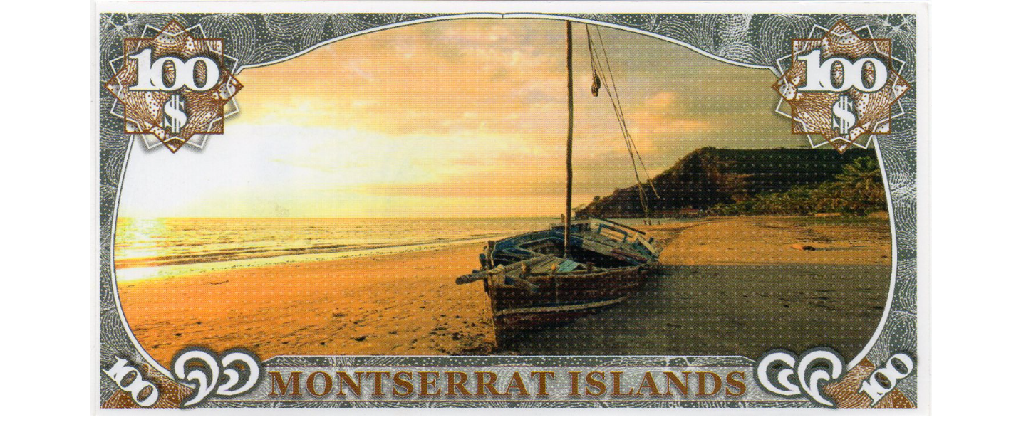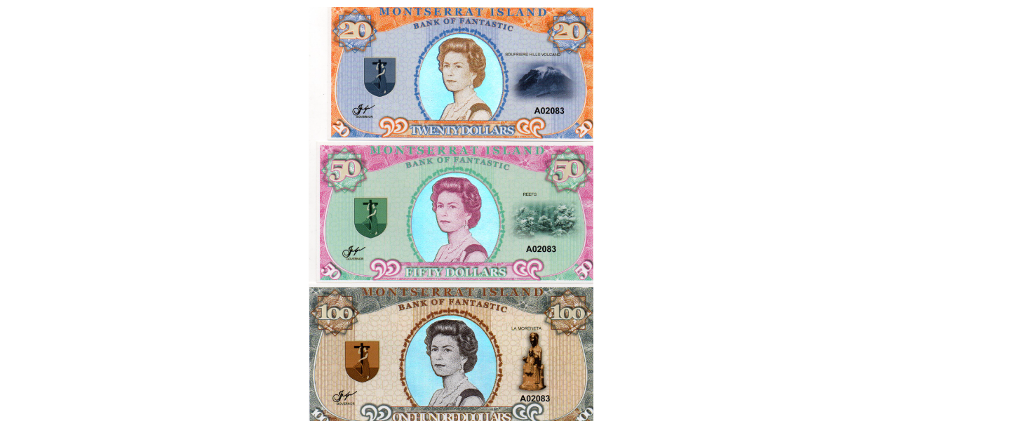 Set de fantasía Reina (3) billetes de Bank of Fantastic - Monserrat Island, valores 20, 50, 100 dólares. SIN CIRCULAR (UNC). Bellos y llamativos ejemplares fantasía.