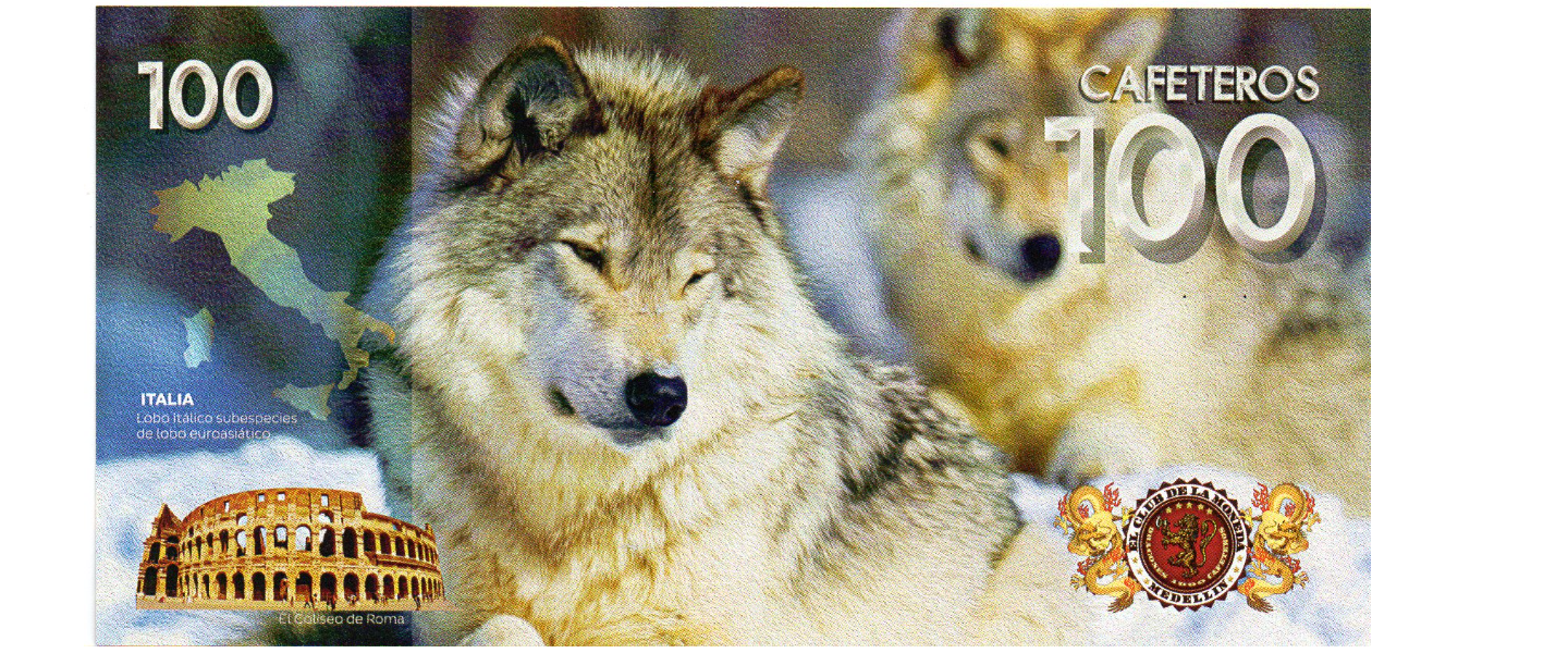 Set de seis (6) billetes ANIMALES EMBLEMÁTICOS, elaborados por Banco de la Moneda, medellin. Denominaciones de 5, 10, 15, 20, 50 y 100 cafeteros.
