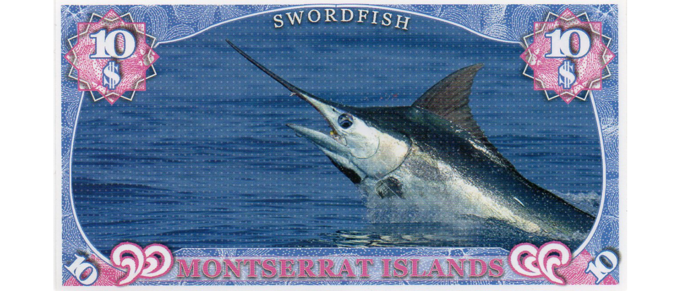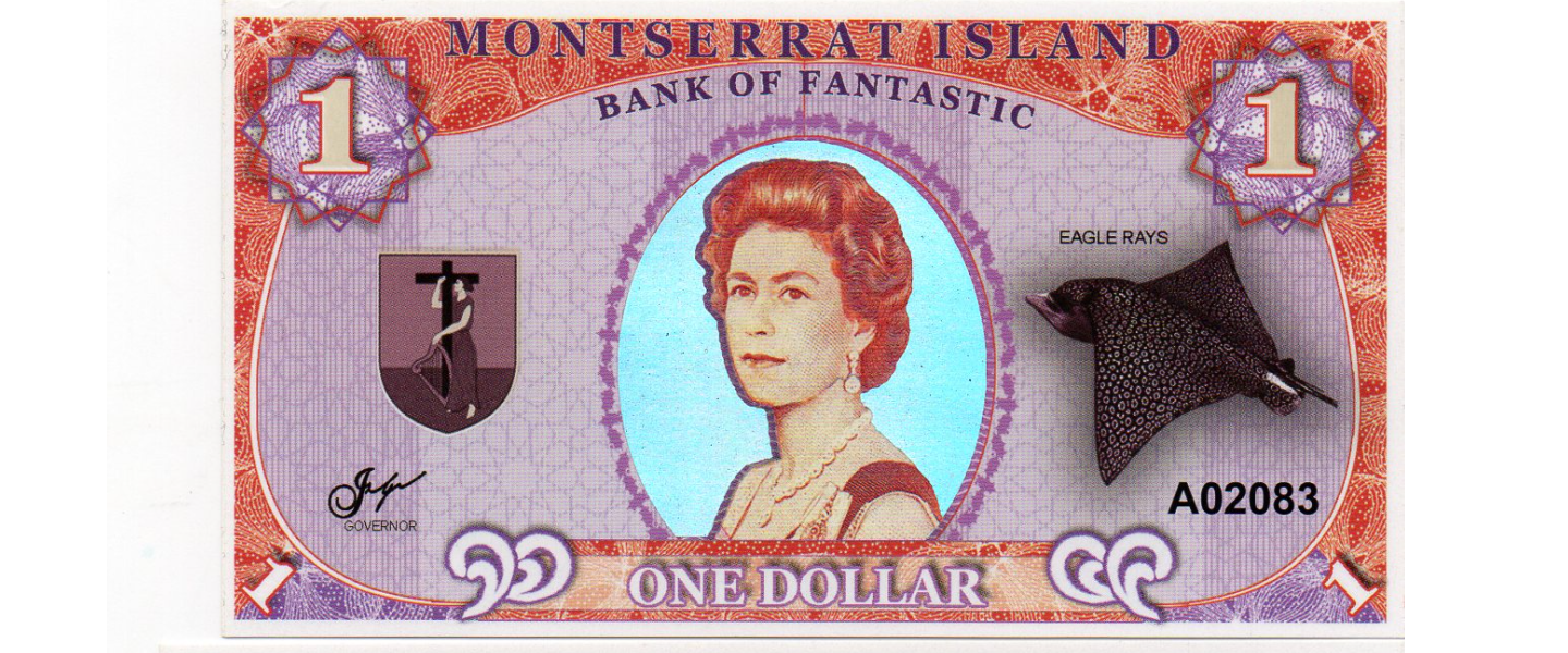 Set de fantasía Reina (3) billetes de Bank of Fantastic - Monserrat Island, valores 1, 5, 10 dólares. SIN CIRCULAR (UNC). Bellos y llamativos ejemplares fantasía