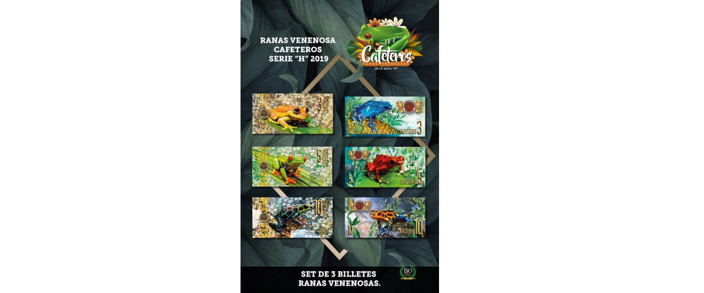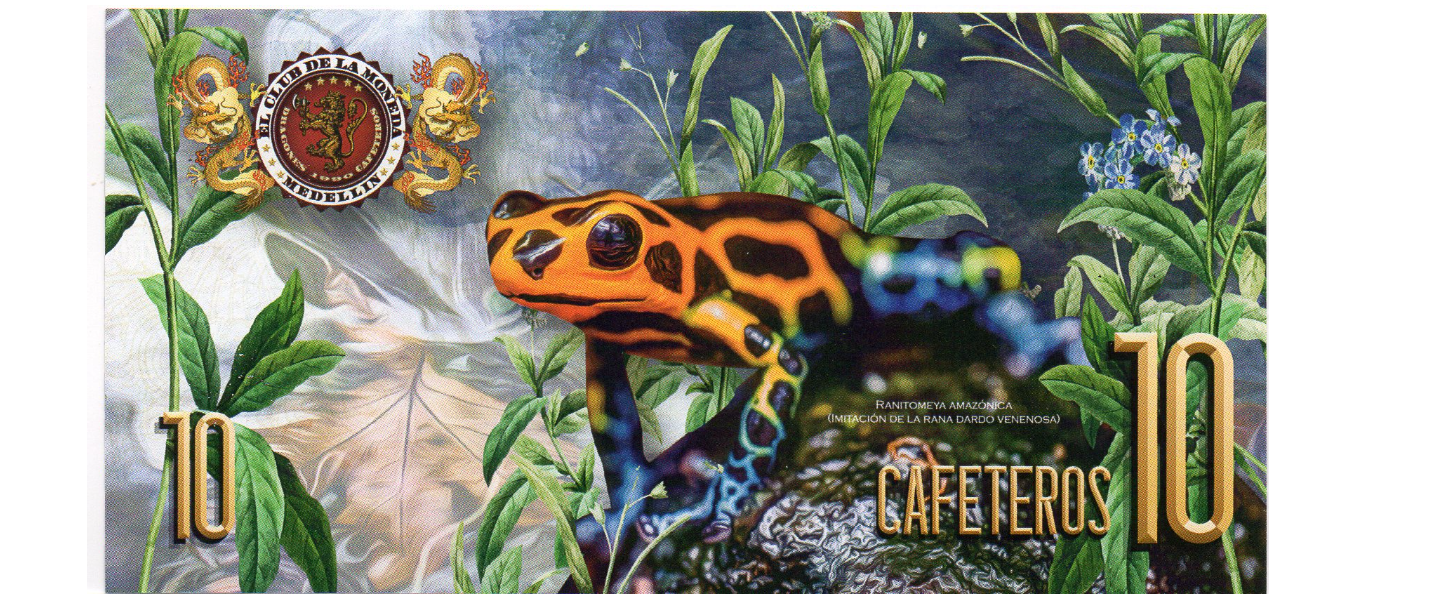 Set de tres (3) billetes RANAS VENENOSAS, elaborados por Banco de la Moneda, Medellín. Denominaciones de 3, 5 y 10 cafeteros, poseen realidad aumentada.