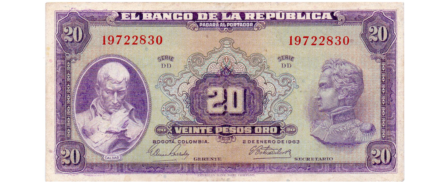 20 Pesos, 02 de enero de 1963, EXTRA FINO- (XF-), ABNC, anverso: Caldas y Bolivar.