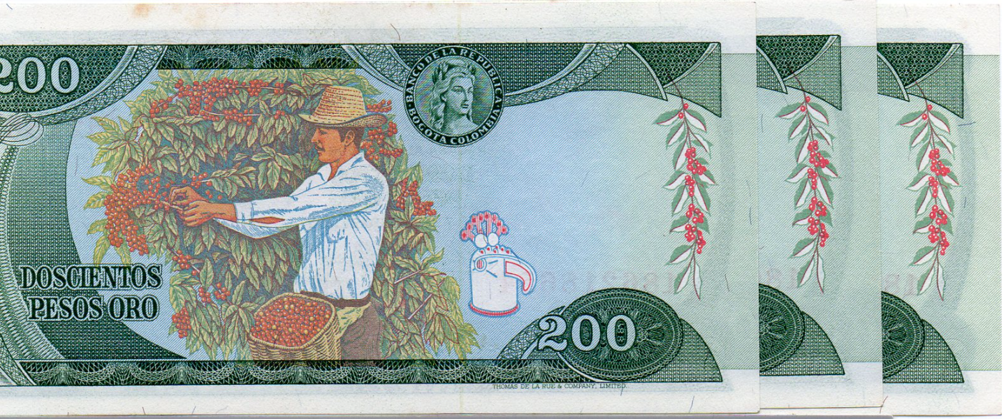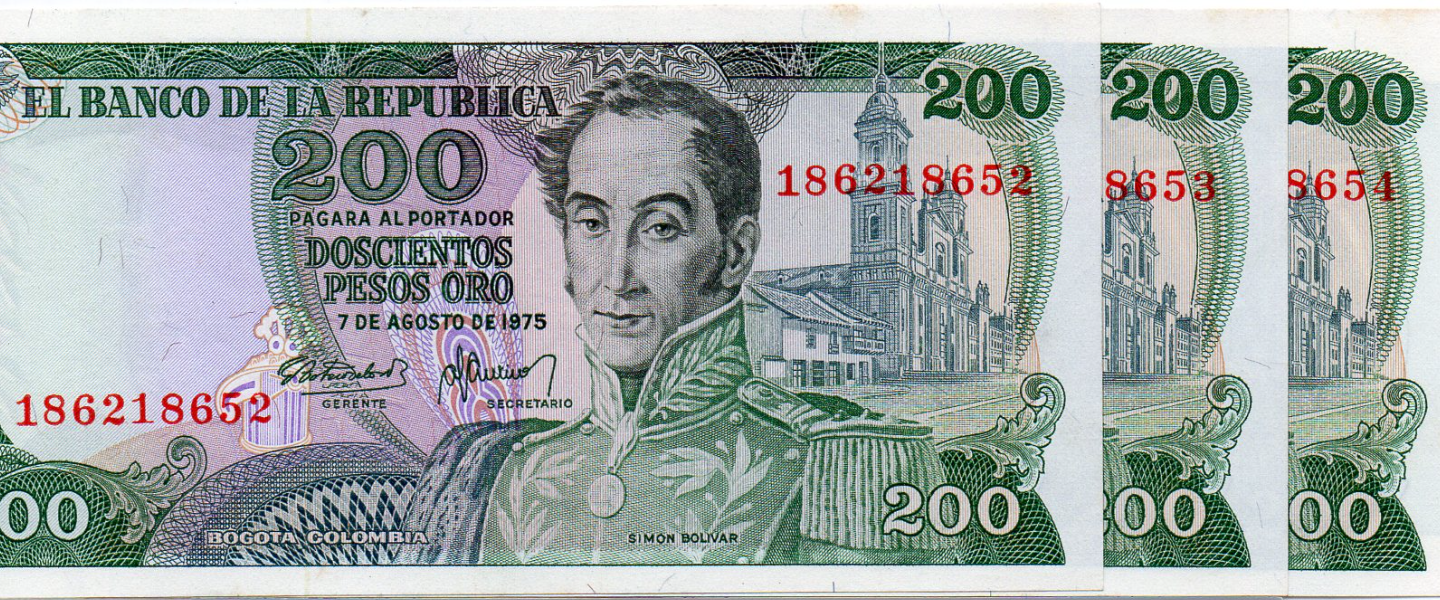 200 Pesos, 7 de agosto de 1975, SIN CIRCULAR (UNC), anverso: Simón Bolívar, reverso: Cafetero. Se ofrece un TRIO de billetes consecutivos.