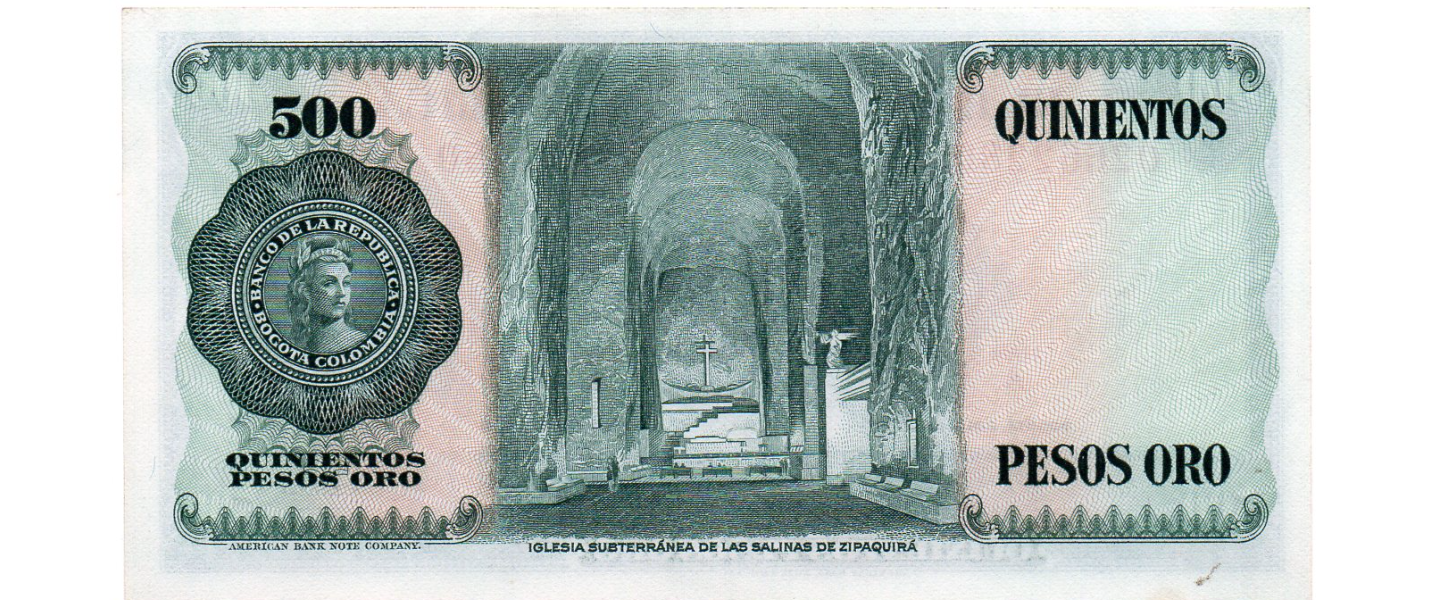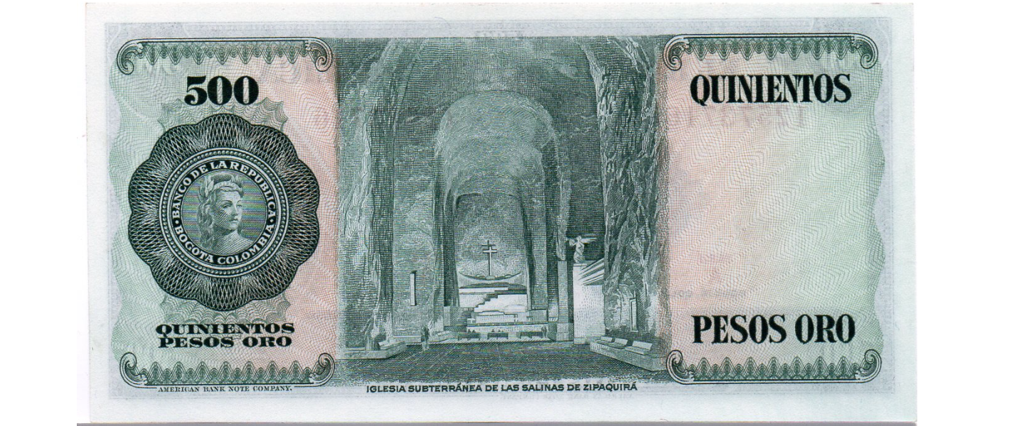 500 Pesos, 01 de enero de 1968, SIN CIRCULAR (UNC) NET: pequeña mancha al reverso parte inferior, ABNC, anverso: Simón Bolívar, reverso: Iglesia Subterránea de las salinas de Zipaquirá. Hermosa pieza!