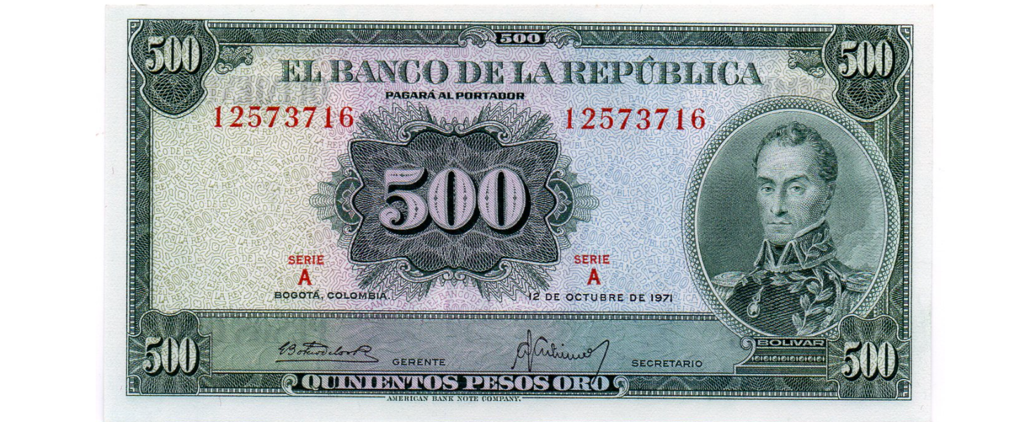 500 Pesos, 12 de octubre de 1971, SIN CIRCULAR (UNC), ABNC, anverso: Simón Bolívar, reverso: Iglesia Subterránea de las salinas de Zipaquirá. Hermosa pieza!