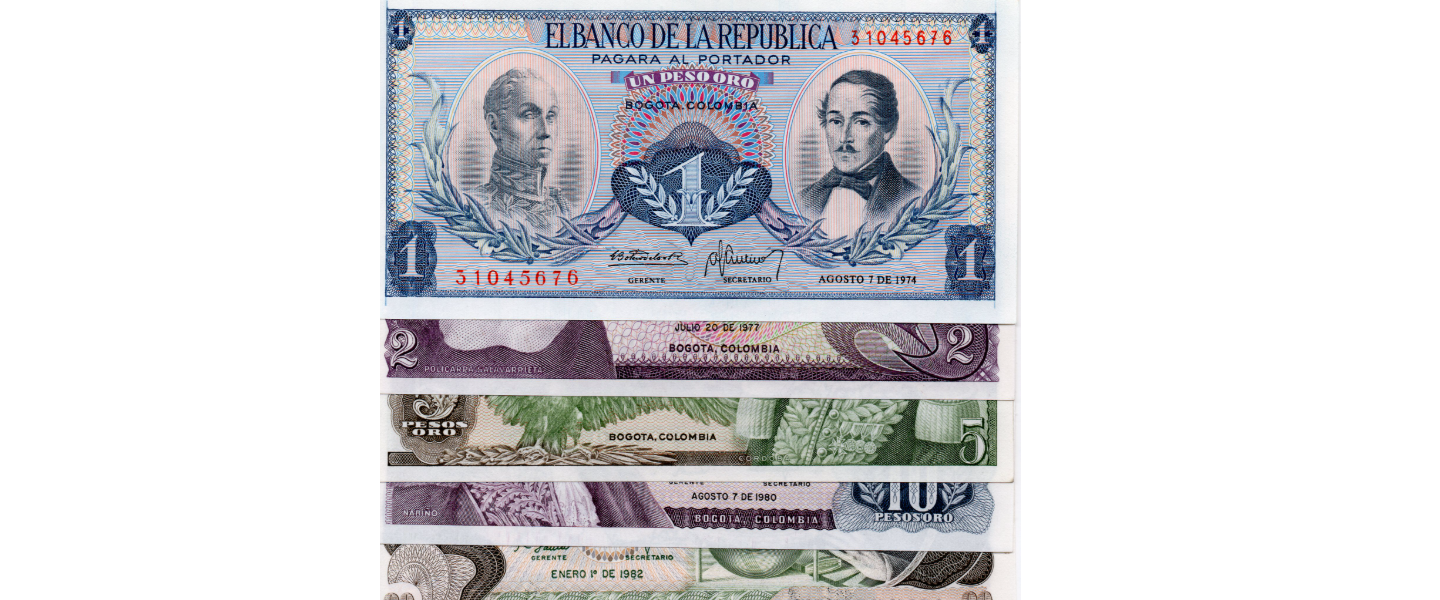 Set conformado por diez (10) billetes de Colombia-BRC, en estado UNC, fechas variadas, denominaciones de 1,2,5,10,20,50,100,200,500 y 1000 pesos.