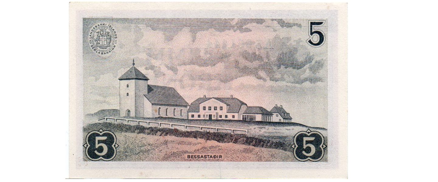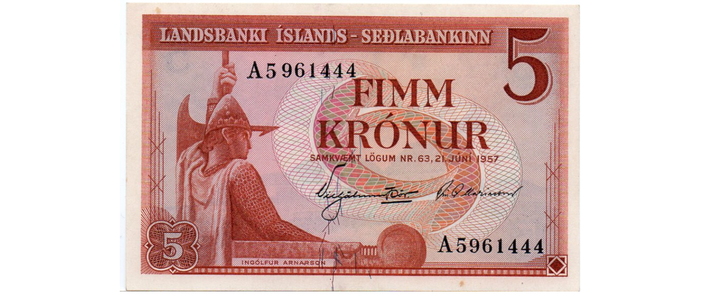 5 Coronas, 21.06.1957, P-48a, SIN CIRCULAR (UNC), Ingólfur Arnarson / Bessastağir.