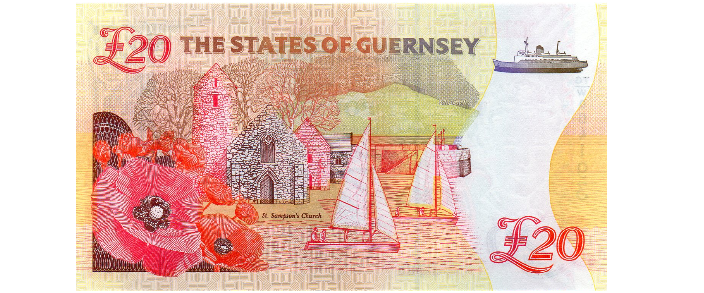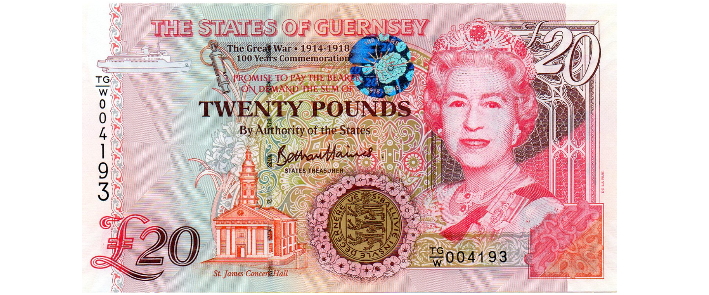 20 Libras, ND(2018), SIN CIRCULAR (UNC), conmemorativo por el Centenario de la gran guerra (Primera Guerra Mundial 1918-2018) sobreimpresión conmemorativa en GUERNSEY P-58 hilo de seguridad segmentado y dispositivo holográfico en el frente, firma: B. Haines. Anverso: Isabel II, Sala de conciertos St. James, reverso: Iglesia de San Sampson, castillo de Vale, veleros, ferry. Simplemente hermosa pieza!!