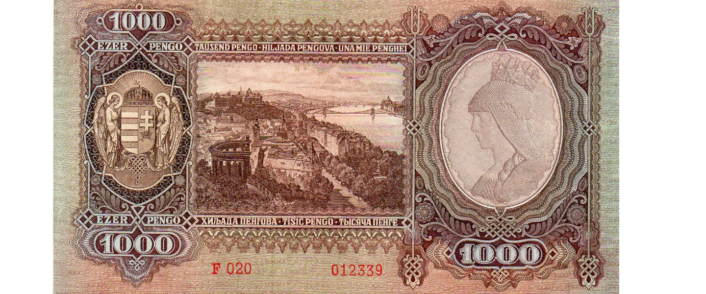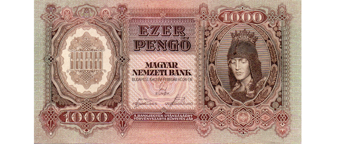1000 Pengo, 24.02.1943, SIN CIRCULAR (UNC), Gobierno de Unidad Nacional (Hungría: Szálasi Ferenc in Veszprém), anverso: "Hungaria" (estatua en Arad), reverso: Budapest. Una hermosura de billete.
