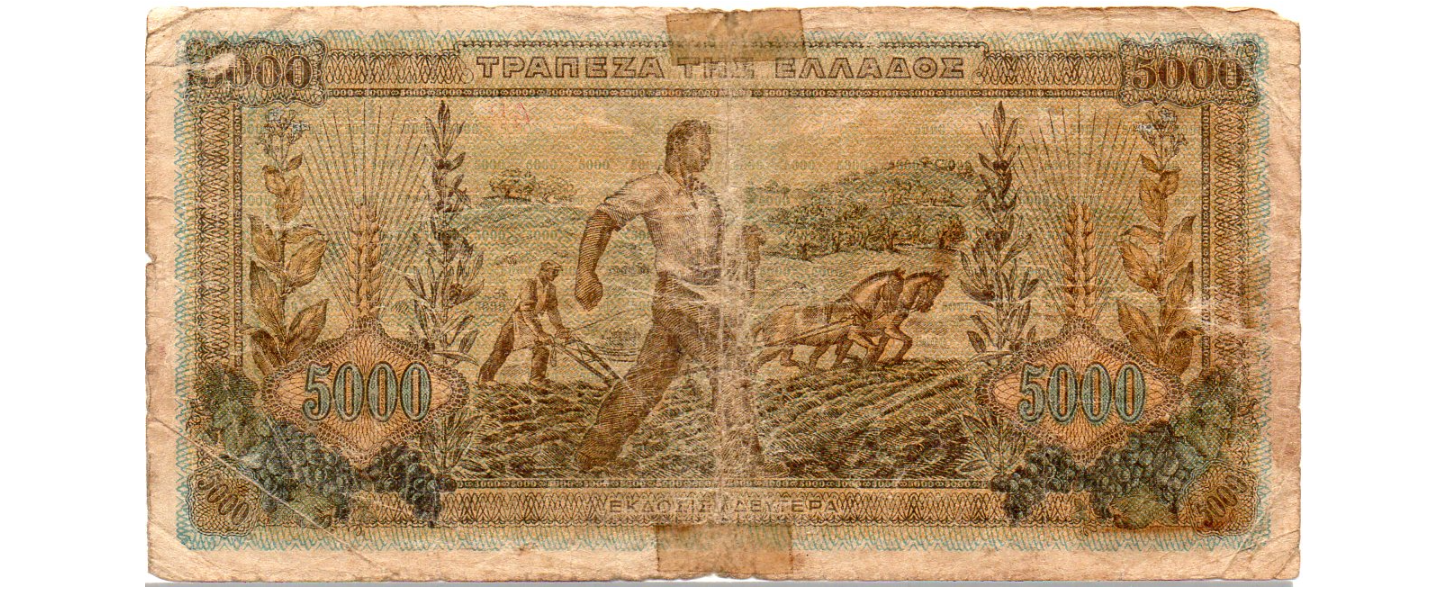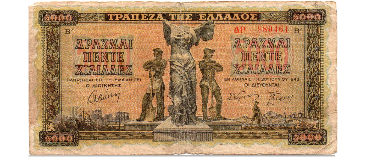 5.000 Dracmas, 20.06.1942, P-119a(2), MUY BUENO (VG), La Victoria de Samotracia Niké, trabajo de campo.