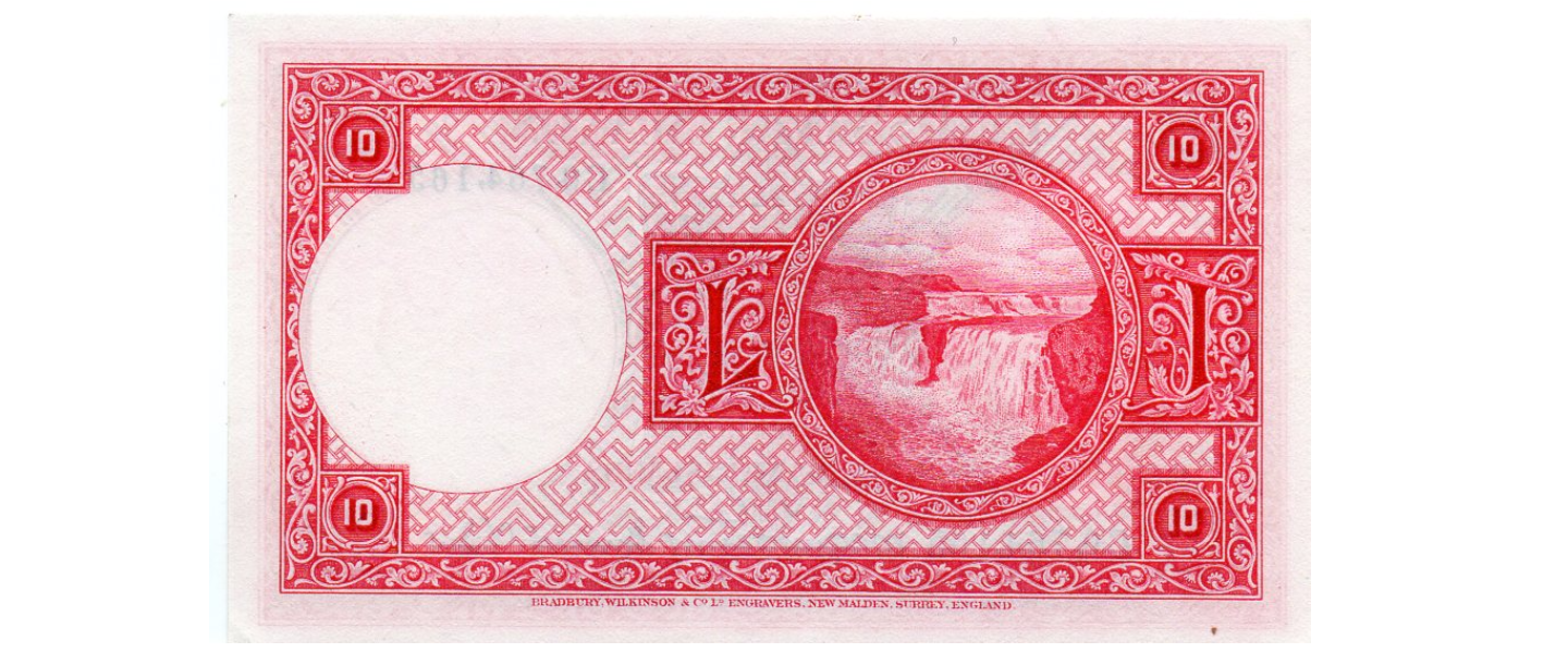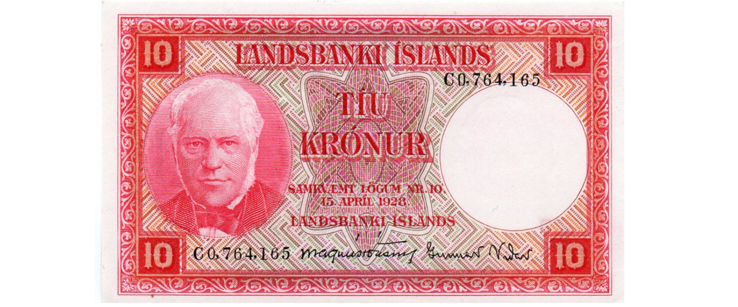 10 Coronas, L. 15.04.1928, P-33b(5), CASI SIN CIRCULAR (UNC), serial # prefijo C, firmas: Magnús Jónsson & Gunnar Viðar, Impresor: Bradbury Wilkinson, New Malden, anv. Jón Sigurðsson, rev. Dettifoss (Catarata mas larga de Europa)