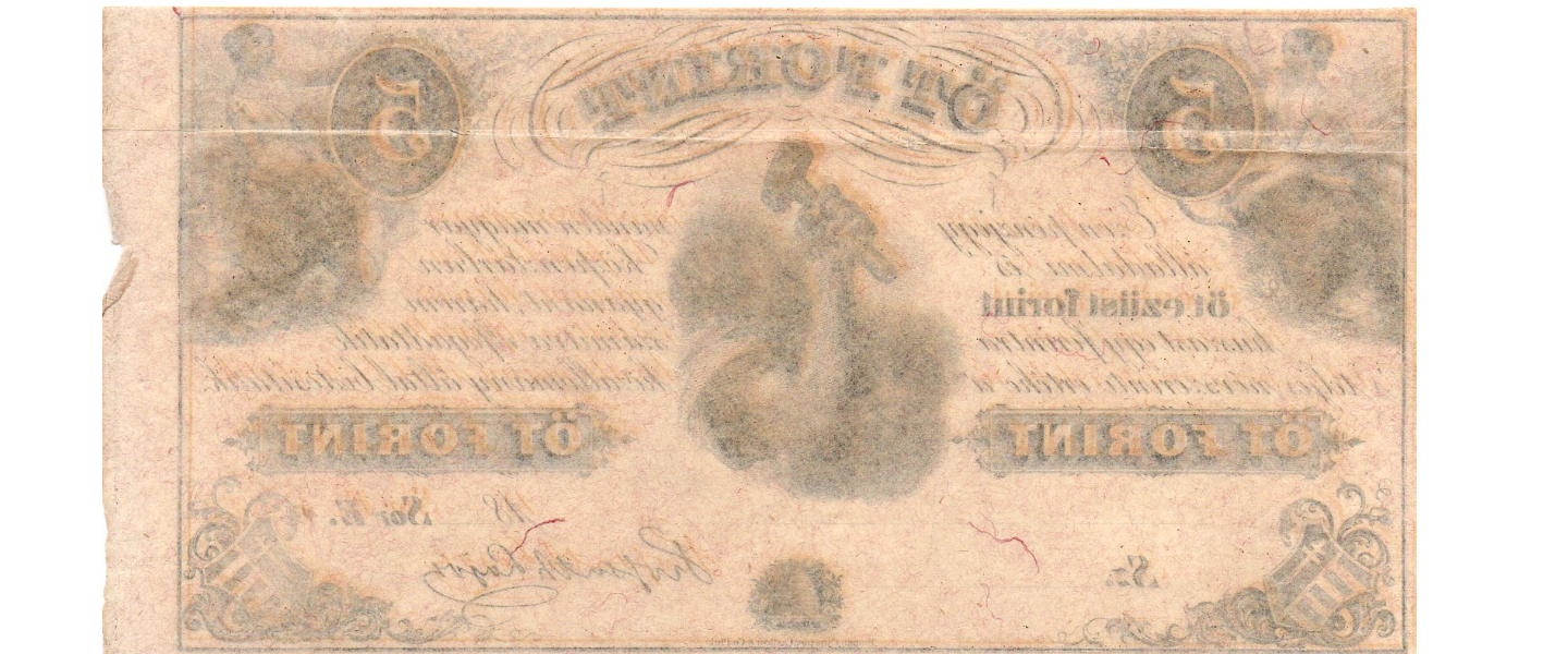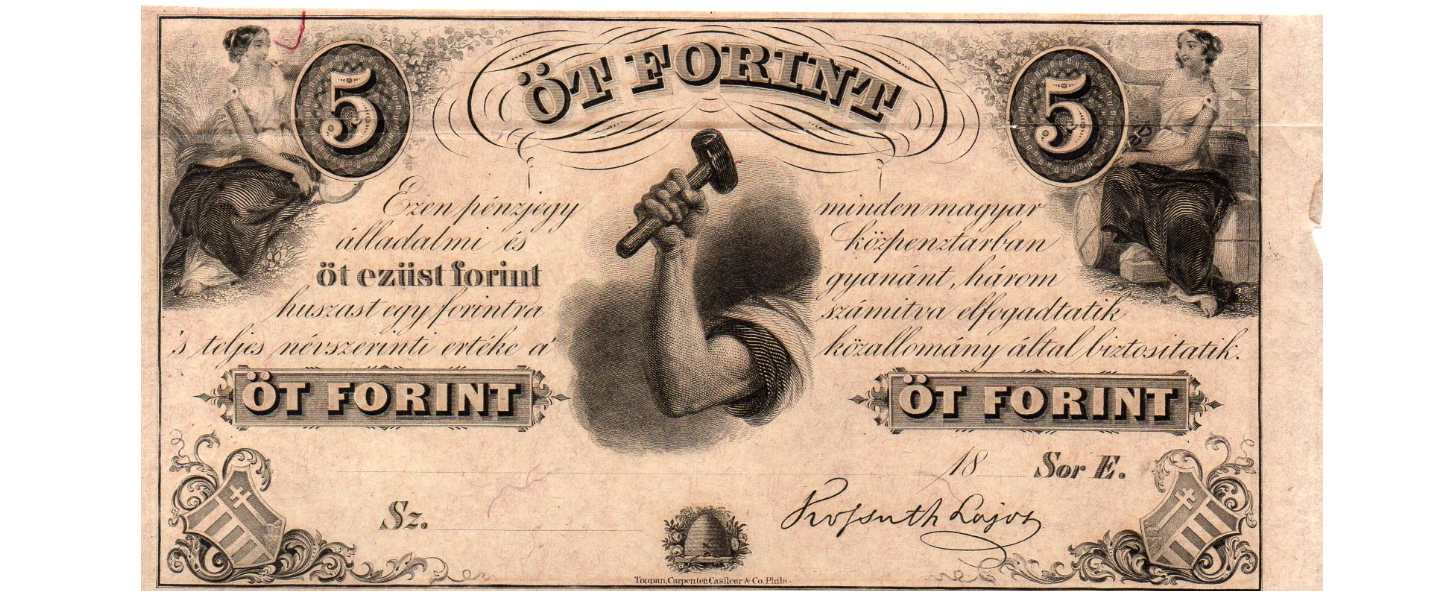 5 Forint, ND (1852), P-S143, EXTRA FINO (XF), Impresor: Toppan, Carpenter, Casilear & Co, Philadelphia PA, mujeres alegóricas, brazo con martillo, colmena, escudo de armas Húngaro, remainder. Nota: formato grande.