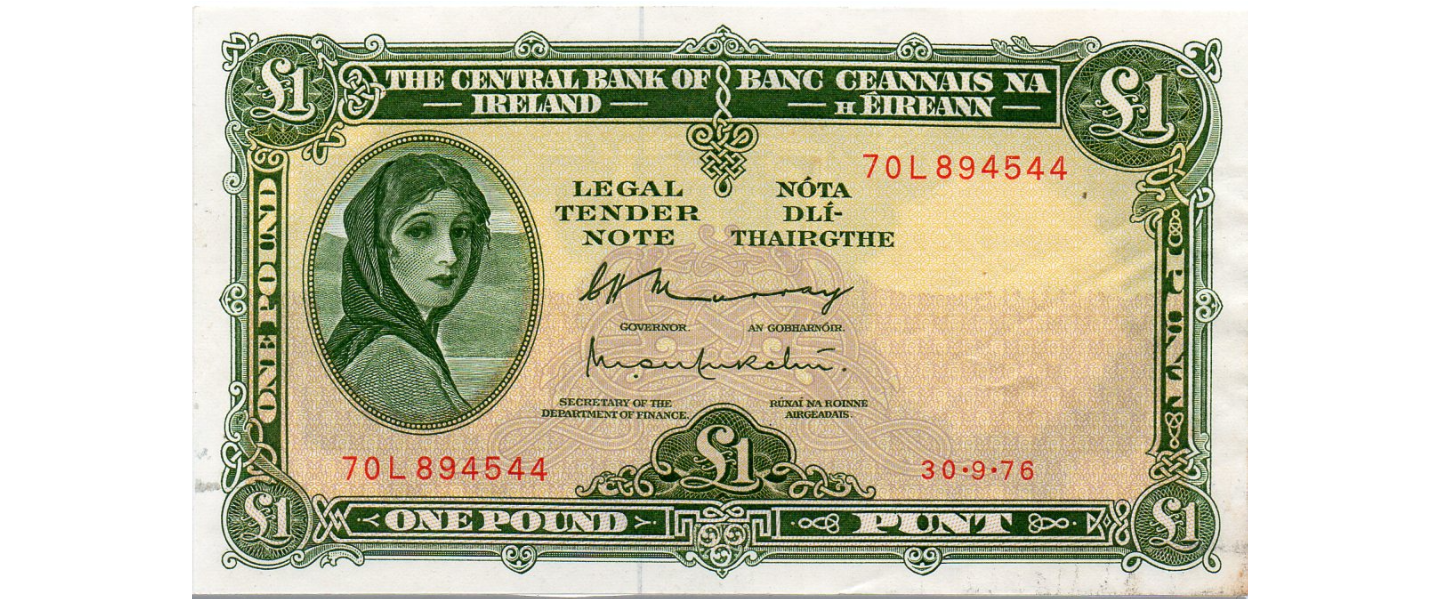1 Libra, 30.09.1976, P-64d, EXTRA FINO (XF), firmas: Murray & O'Murchu. Lady Hazel Lavery / Espíritu de agua del río Lee.