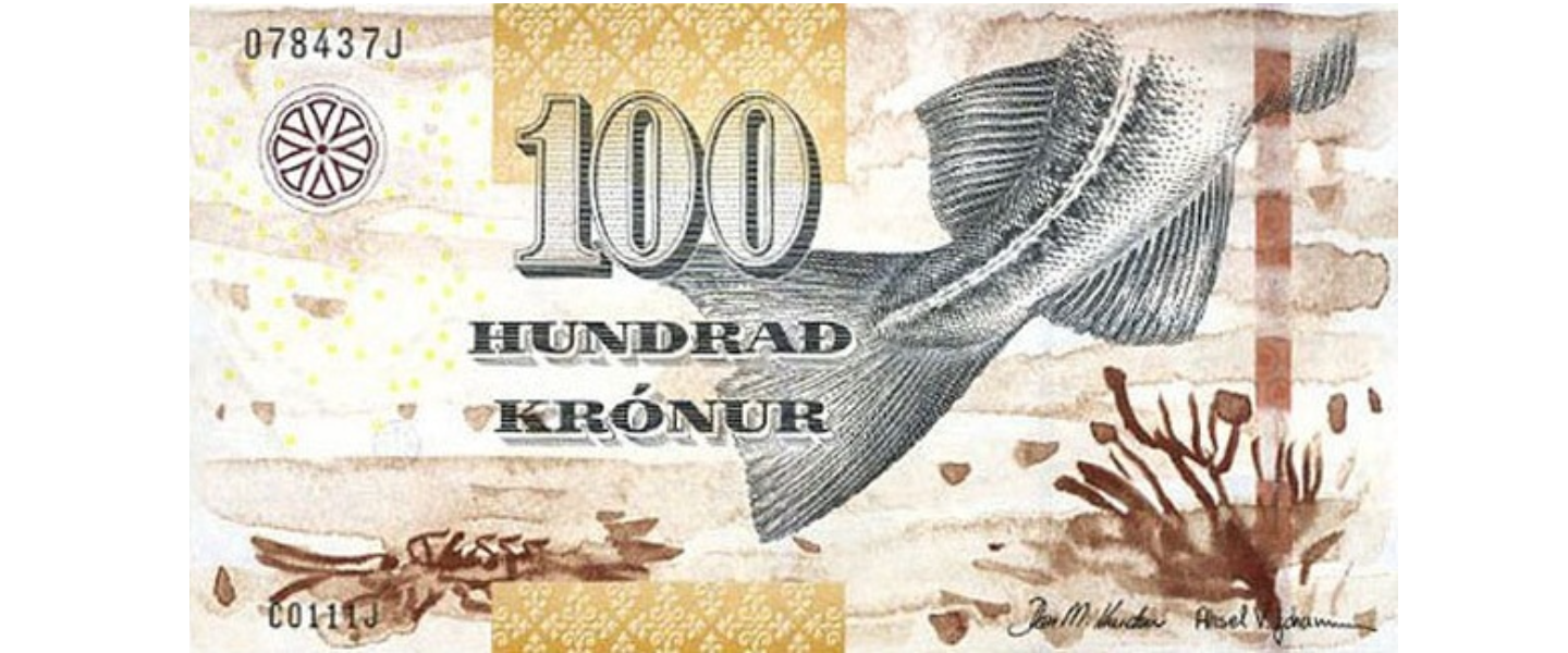 100 Coronas, 2011, EXTRA FINO (XF), anverso: Cola de un bacalao, reverso: ciudad y municipio Klaksvik.