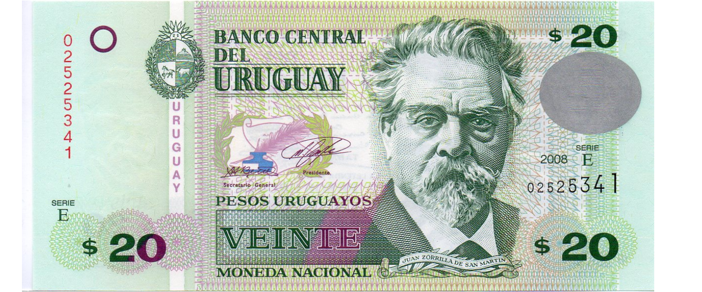 20 Pesos Uruguayos, 2008, P-86a, SIN CIRCULAR (UNC), Impresor: François Charles Oberthur Fiduciaire, Juan Zorrilla de San Martín, Alegoría.