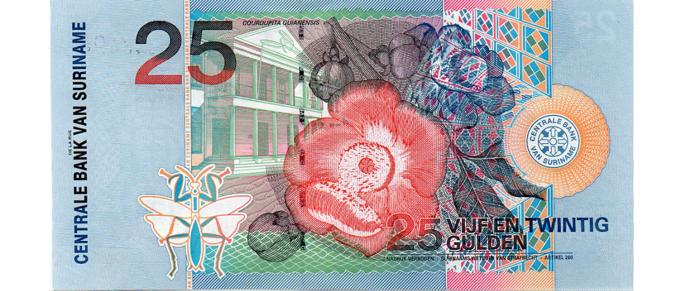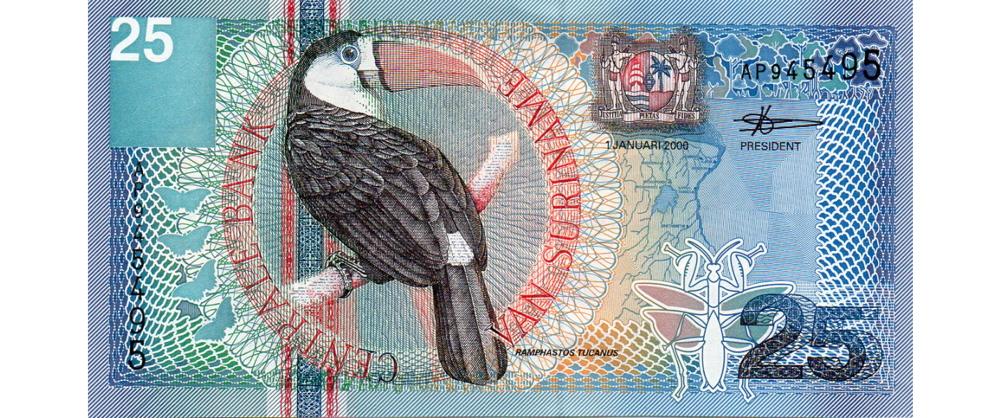 25 Gulden, 2000, SIN CIRCULAR (UNC), anverso: Tucán de pico rojo (ramphastos tucanus), reverso: Edificio del Banco Central (Paramaribo), Flor de bala de cañón (couroupita guianensis).
