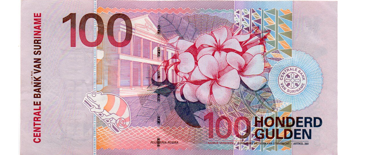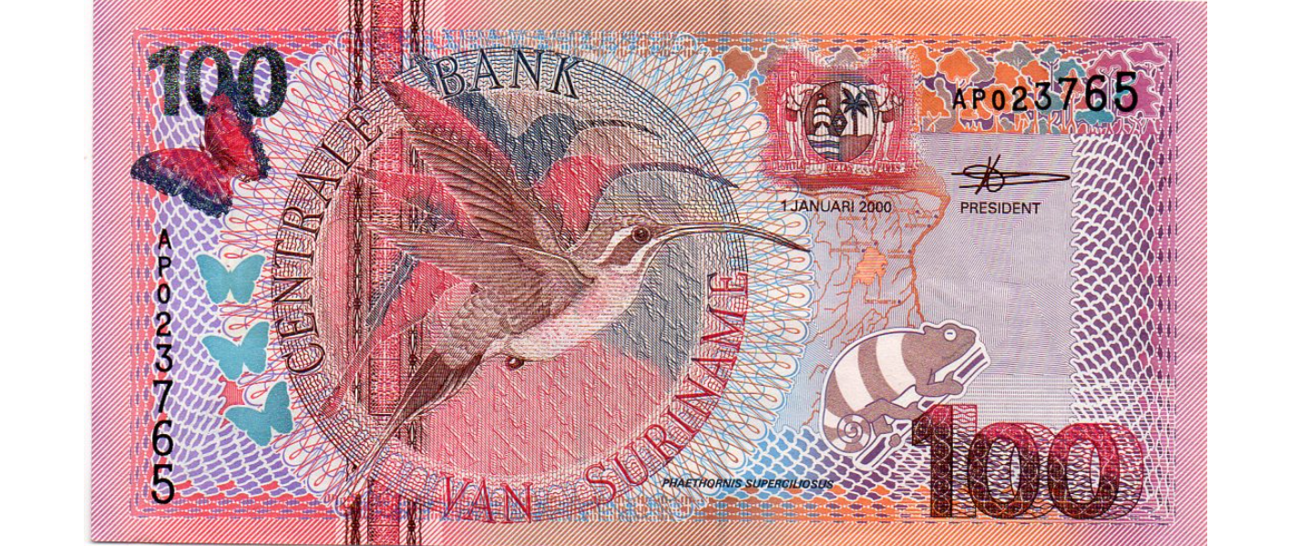 100 Florín neerlandés, 01.01.2000, P-149, EXTRA FINO (XF), (phaetornis superciliosus), Edificio del Banco Central (Paramaribo), flores (plumeria rubra).