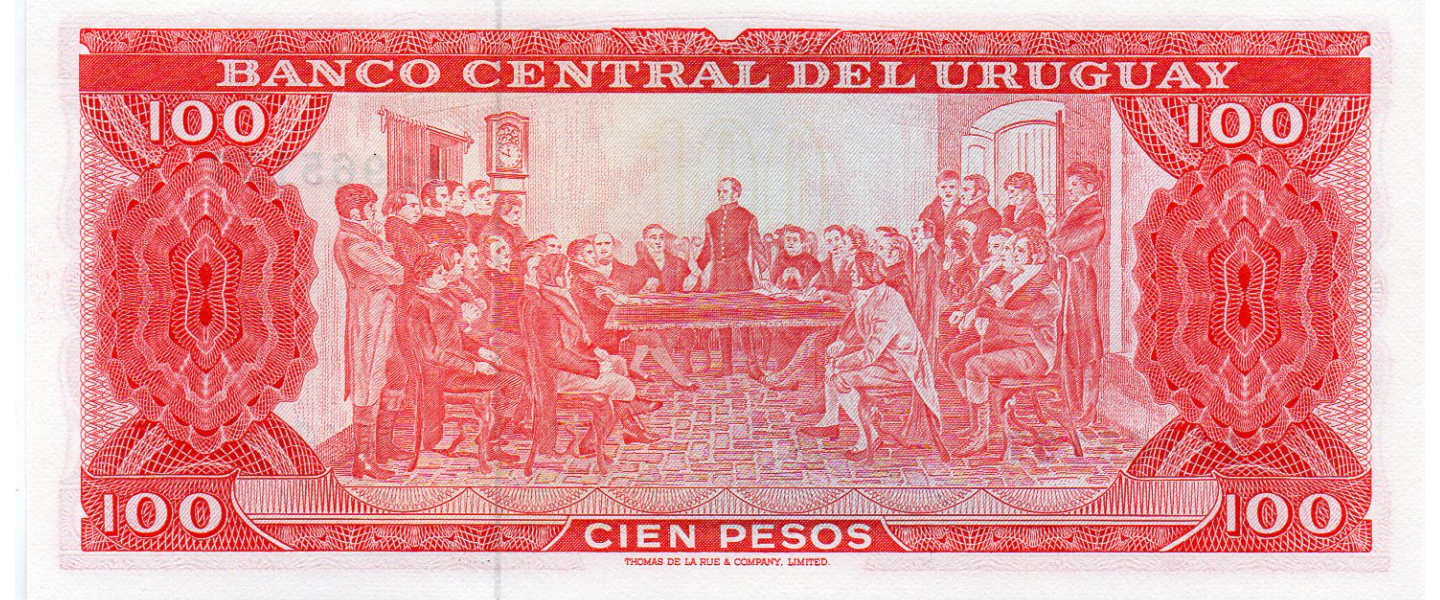 100 Pesos, ND (1967), SIN CIRCULAR (UNC), anverso: General José Gervasio Artigas, reverso: Reunión de independencia.