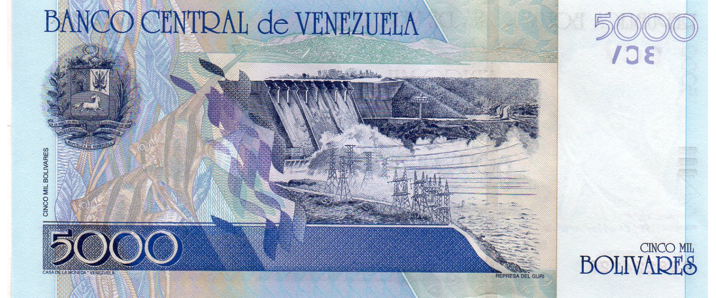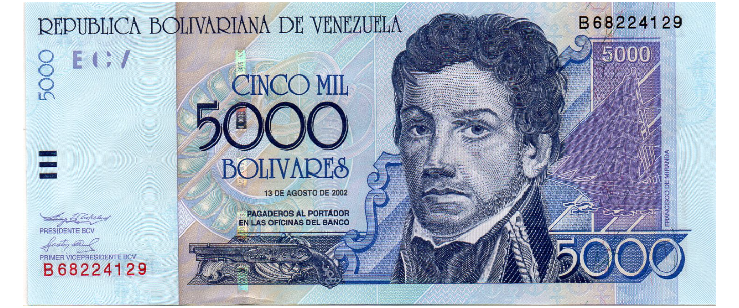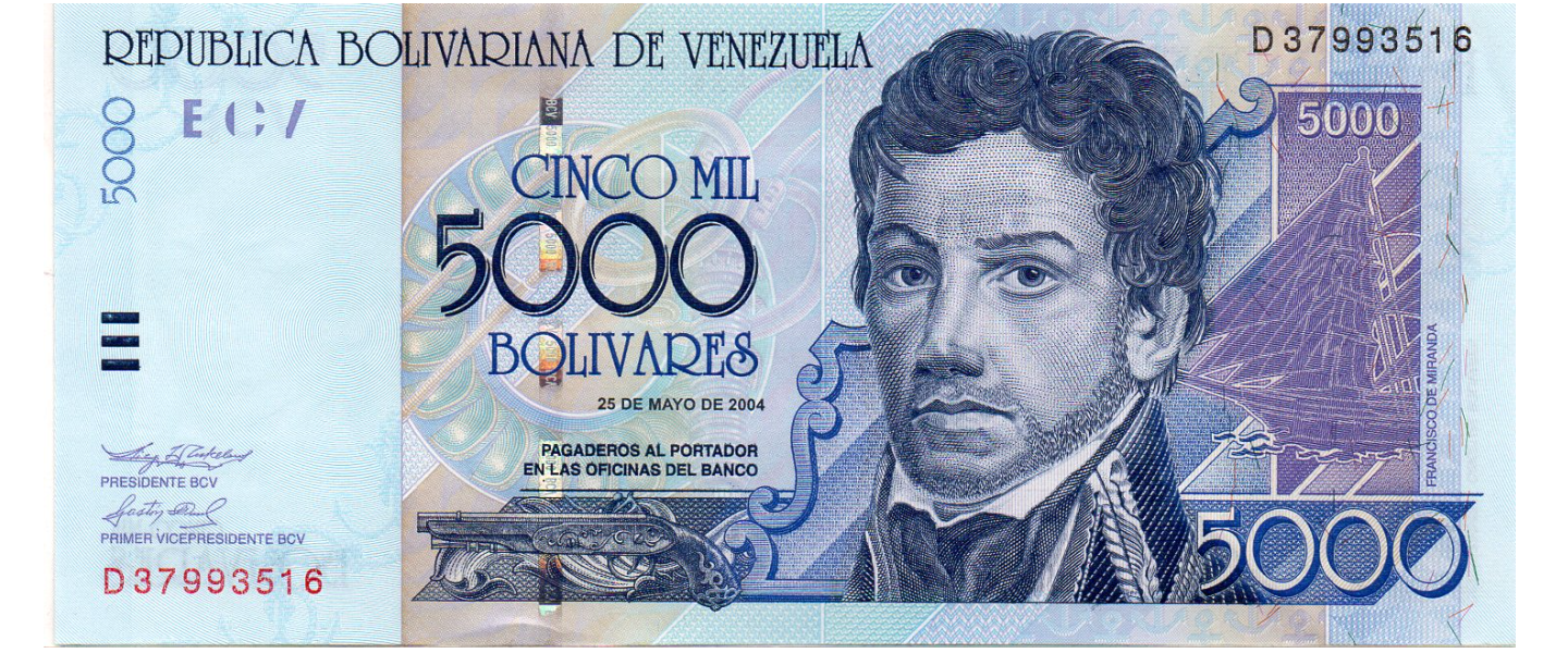 5000 Bolívares, 25 mayo 2004, CASI SIN CIRCULAR (AUNC), leve doblez diagonal. Anverso: Francisco de Miranda, reverso: Presa hidroeléctrica de Guri.