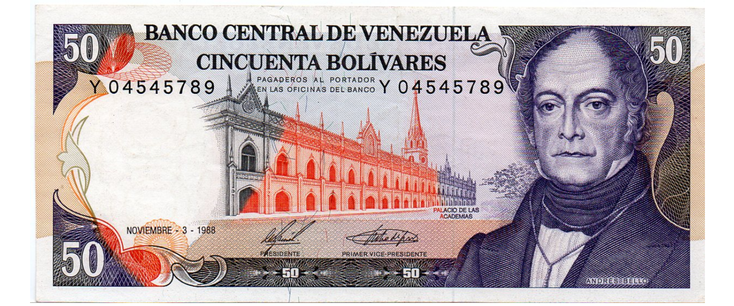 50 Bolívares, 03.11.1988, P-65b, CASI SIN CIRCULAR (aUNC), Y, dos pequeños números "50" en el fondo al anverso, Palacio de las Academias, Caracas; Andrés Bello, Edificio del Banco Central, Caracas.