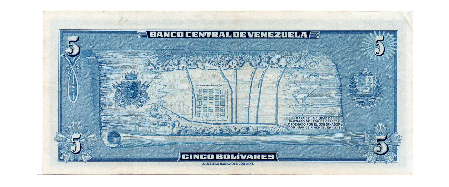 5 Bolívares, 10.05.1966, P-49, MUY FINO (VF), American Bank Note Company, 400th Aniversario fundación de Caracas (1567-1967), serie B, Simón Bolívar, plano antiguo de Santiago de León de Caracas.