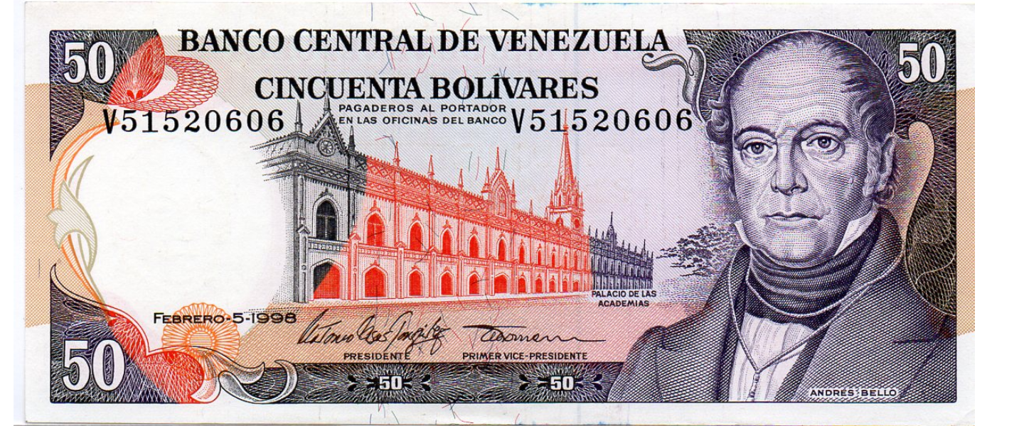 50 Bolívares, 05.02.1998, P-65f, EXTRA FINO (XF), V, dos pequeños números "50" en el fondo al anverso, Palacio de las Academias, Caracas; Andrés Bello, Edificio del Banco Central, Caracas.