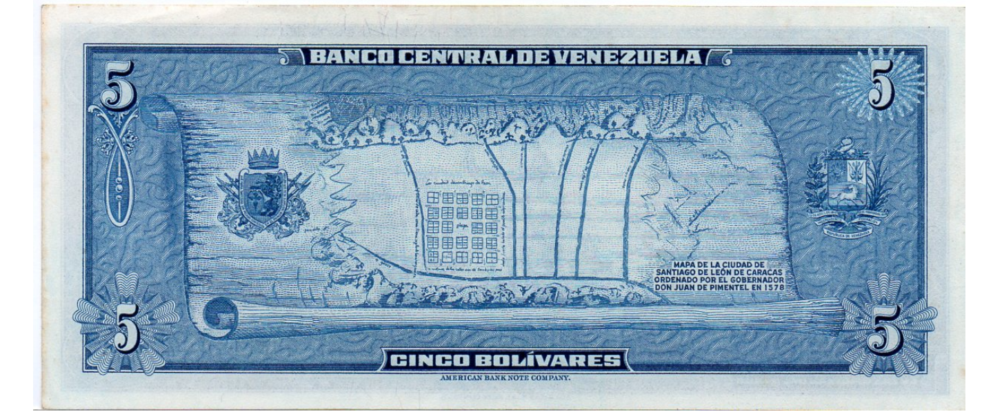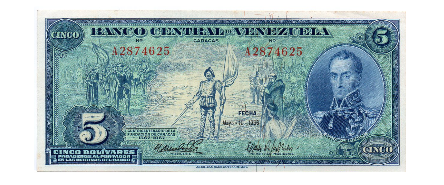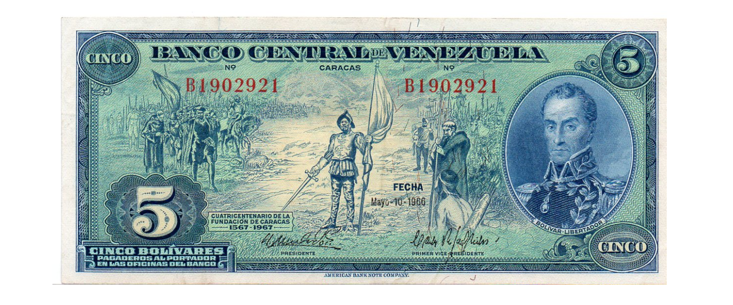 5 Bolívares, 10.05.1966, P-43, CASI SIN CIRCULAR (aUNC), American Bank Note Company, 400th Aniversario fundación de Caracas (1567-1967), serie A, Simón Bolívar, plano antiguo de Santiago de León de Caracas.