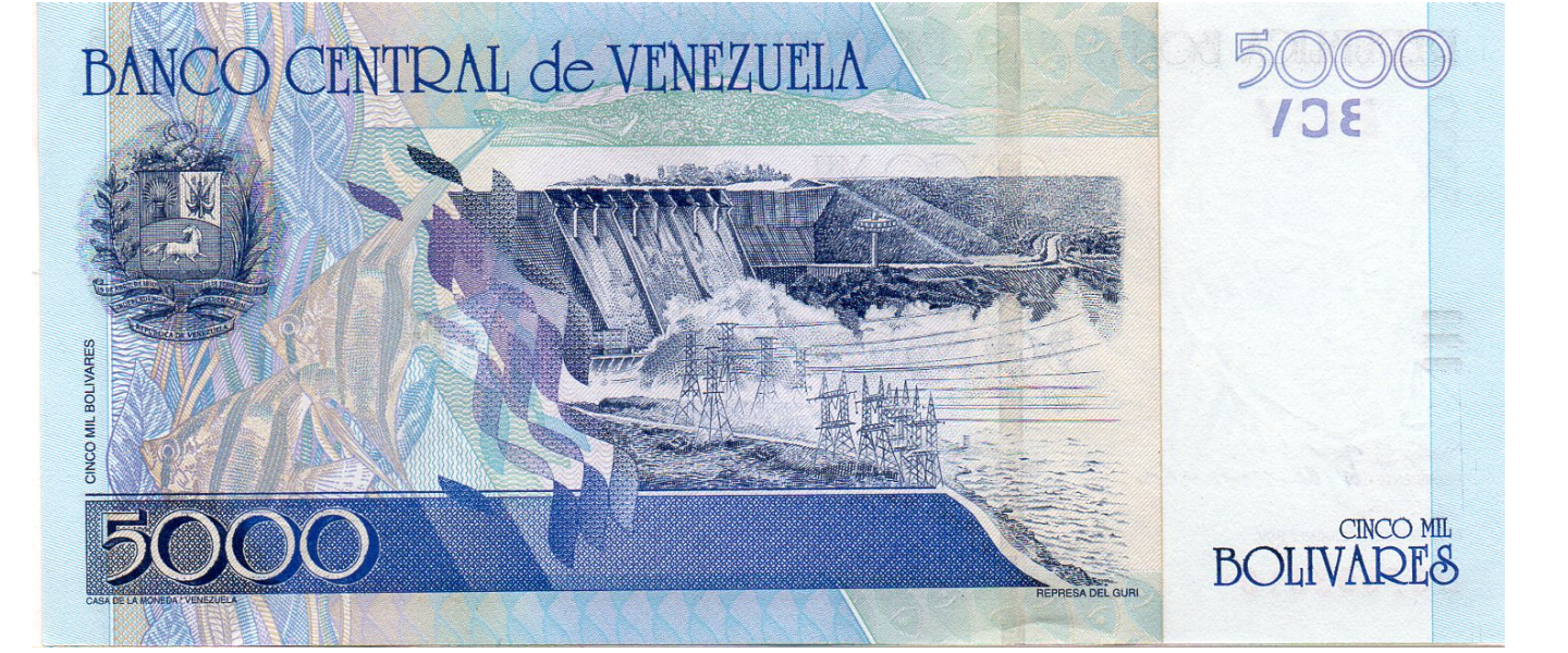 5000 Bolívares, 13 agosto 2012, CASI SIN CIRCULAR (AUNC), leve doblez diagonal. Anverso: Francisco de Miranda, reverso: Presa hidroeléctrica de Guri.