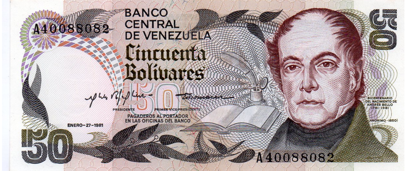 50 Bolívares, 27.01.1981, P-58a, SIN CIRCULAR (UNC), Thomas de la Rue, Londres, Bicentenario del nacimiento de Andrés Bello (1781-1981).