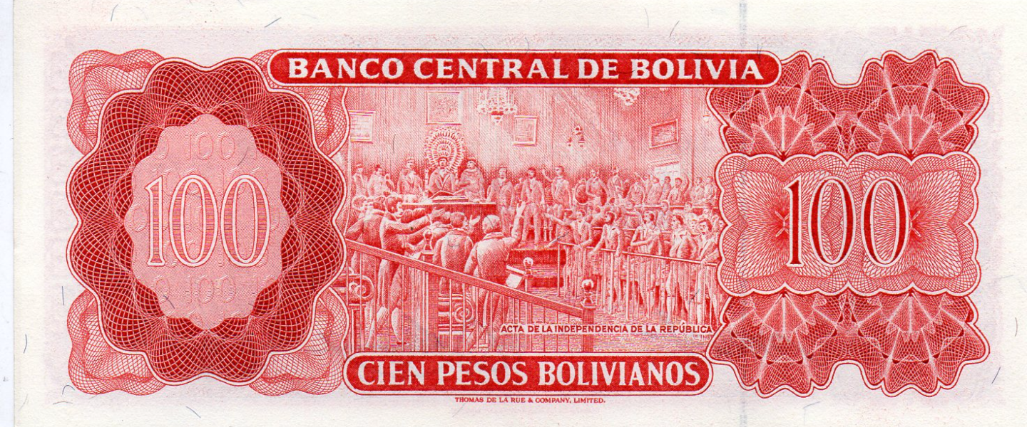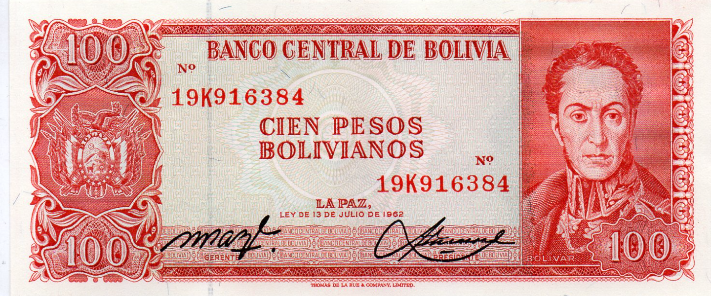 100 Pesos Bolivianos, L. 13.07.1962, CASI SIN CIRCULAR (UNC) leve doblez al centro. Anverso: Simón Bolívar, reverso: Declaración de Independencia, firmas: Milton Paz & Vizcarra.