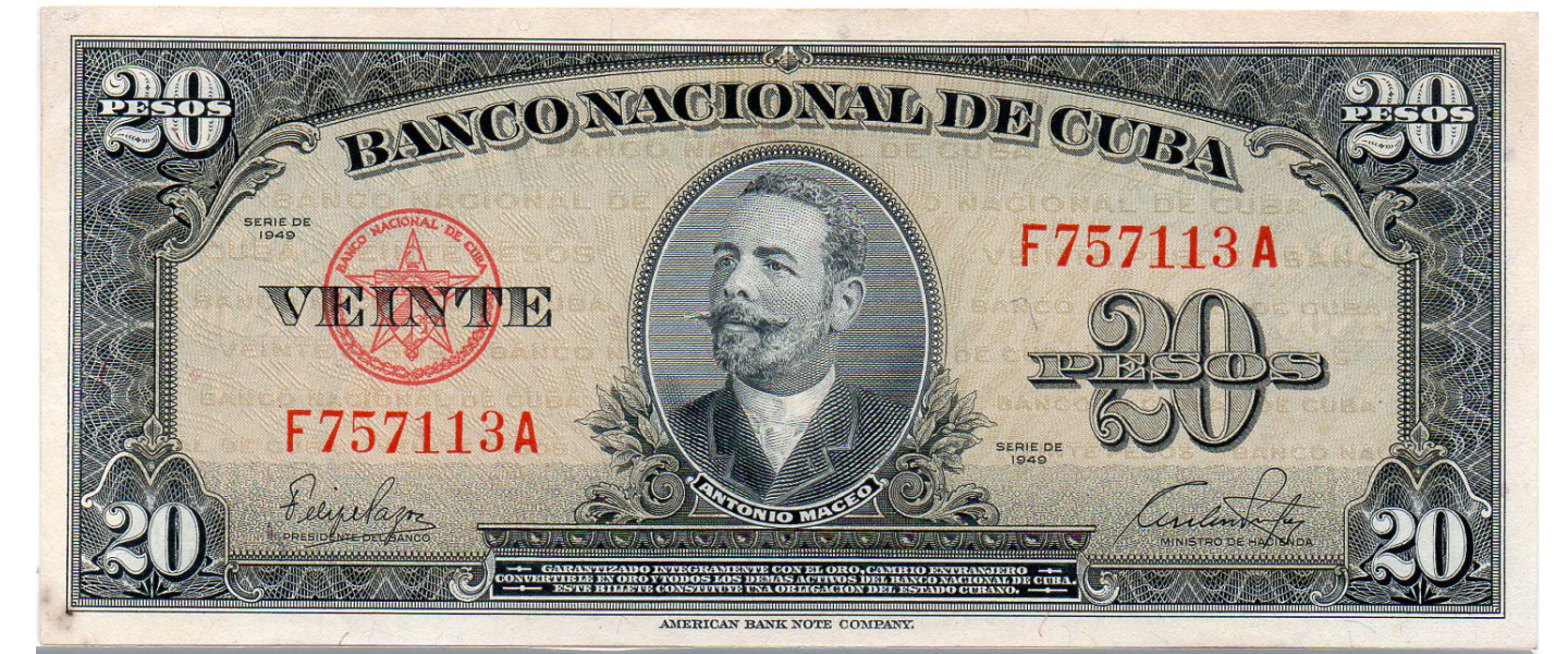 20 Pesos, 1949, Banco Nacional de Cuba, CASI SIN CIRCULAR (AUNC-NET), pequeñas manchas en anverso parte inferior izquierda, ABNC, anverso: Antonio Maceo, reverso: escudo de armas.
