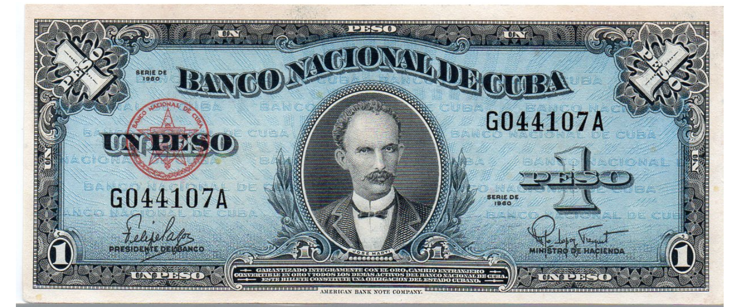 1 Peso, 1960, P-77b, CASI SIN CIRCULAR (aUNC), José Martí, escudo de armas. Punta inferior izquierda redondeada.