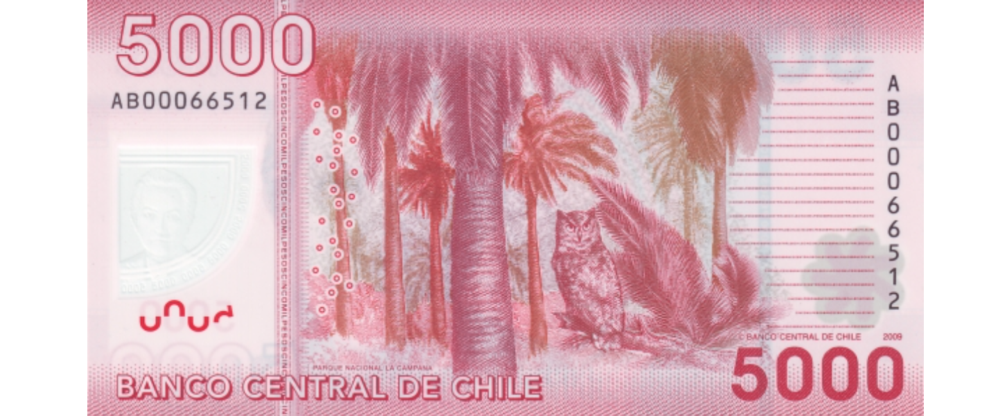 5.000 Pesos, 2009, SIN CIRCULAR (UNC), anverso: Gabriela Mistral, Flor Nacional de Chile (Bellflower / Lapageria rosea / Copihue); reverso: Palmera y Búho cornudo (Bubo magellanicus) en el Parque Nacional "La Campana".