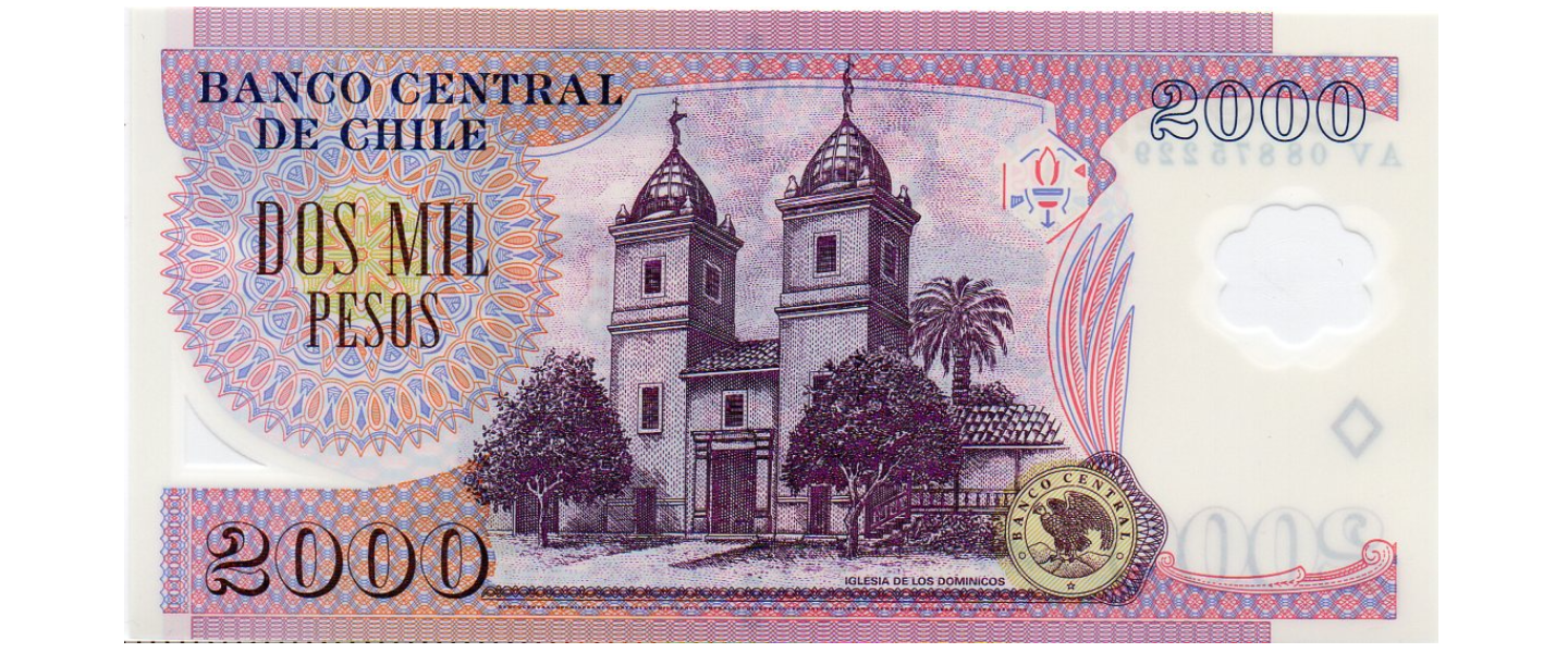2.000 Pesos, 2008, P-160c, SIN CIRCULAR (UNC), material polímero, Manuel Rodrigues Erdoyza, Iglesia Los Dominicos, Santiago de Chile.
