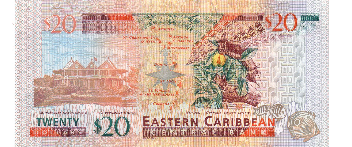 20 Dólares, ND(2003), P-53b, SIN CIRCULAR (UNC), Elizabeth II, hilo de seguridad segmentado ancho, Casa de Gobierno (Montserrat), nuez moscada (Granada).