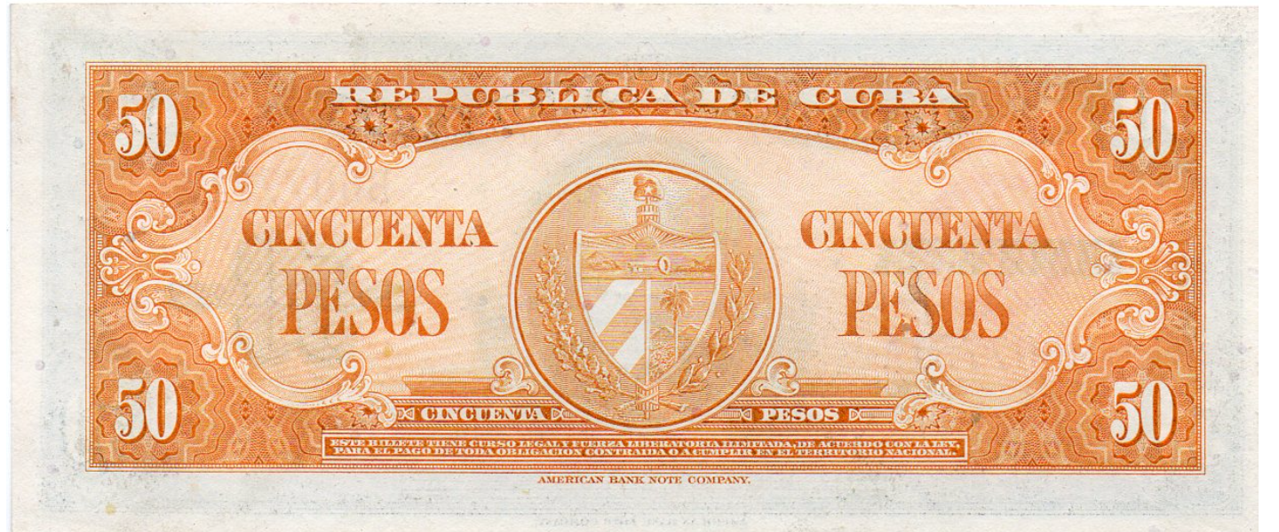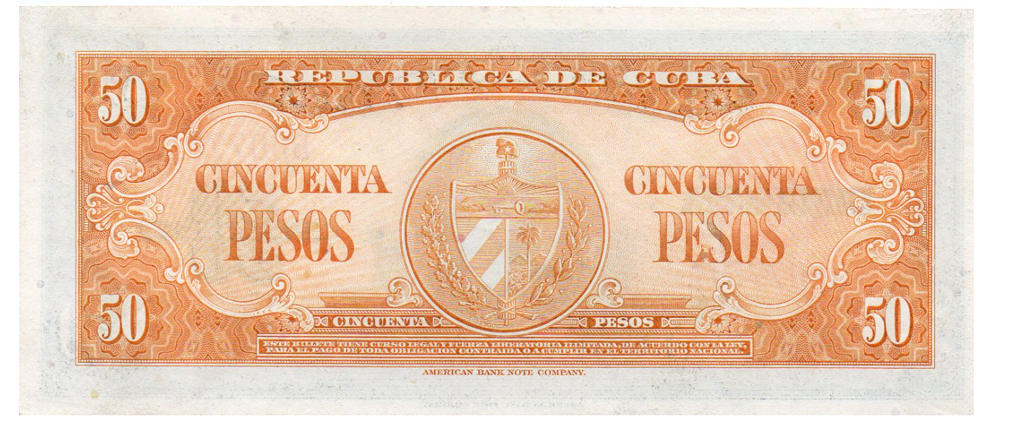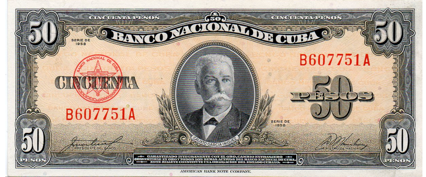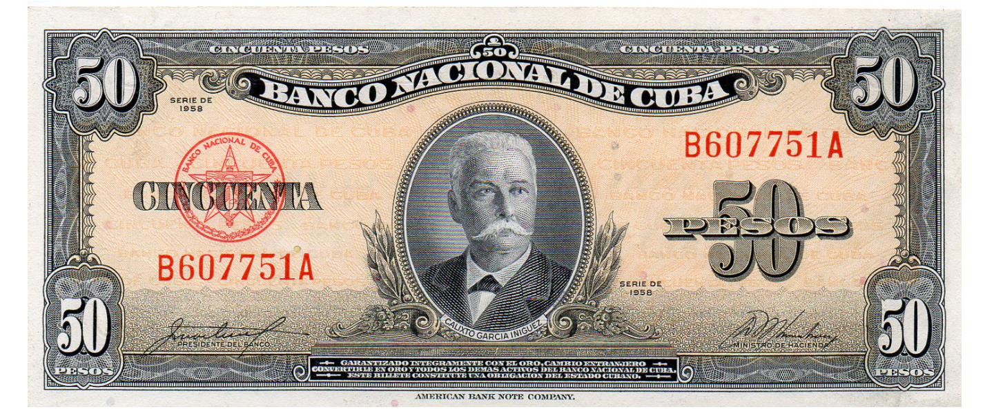 50 Pesos, Banco Nacional de Cuba, 1958, SIN CIRCULAR (UNC), Calixto García Iñiguez, reverso: escudo de armas. ABNC.