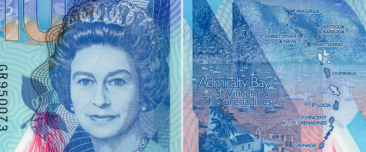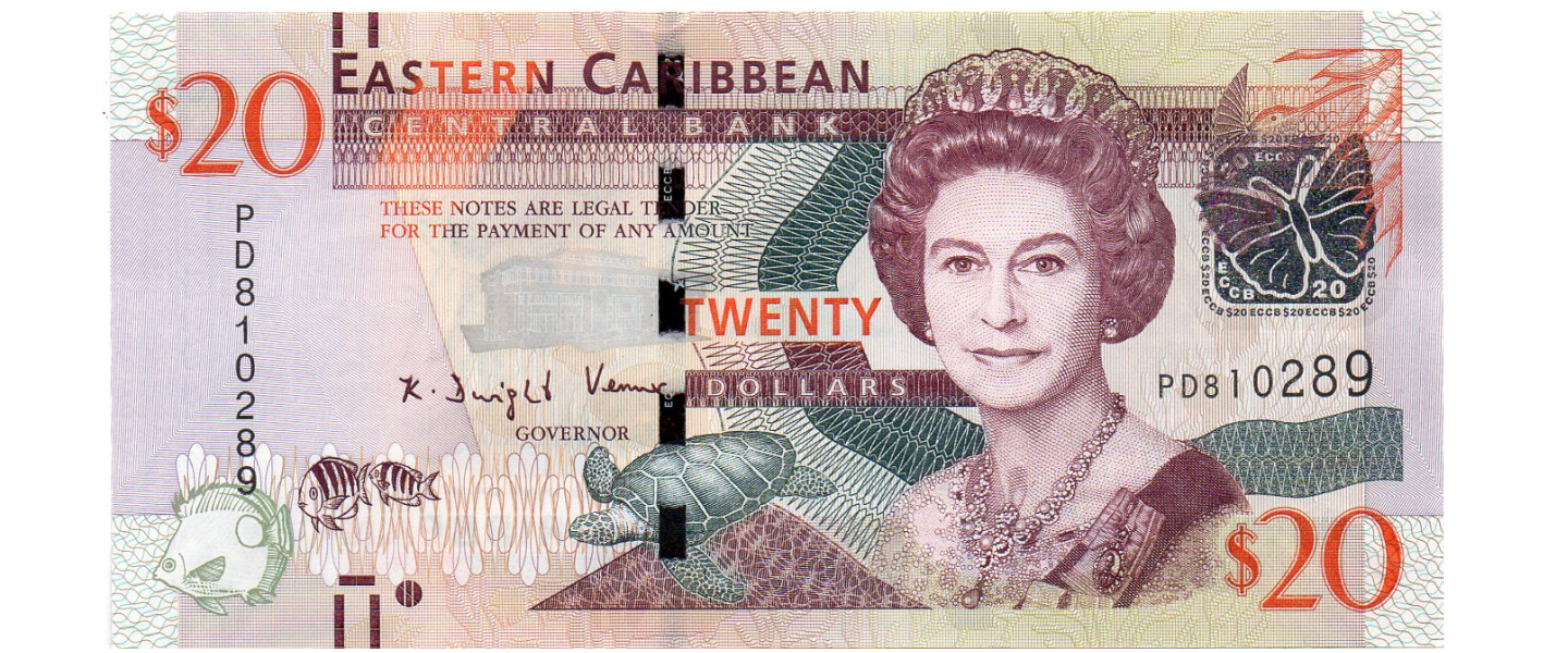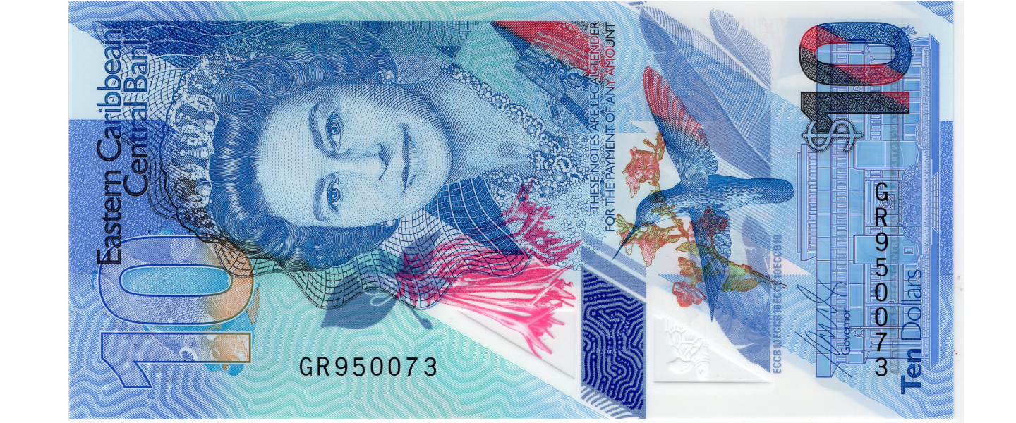 10 Dólares, ND (2019), SIN CIRCULAR (UNC), La Reina Isabel II llevando la tiara de la Gran Duquesa Vladimir y el collar del jubileo de oro de la Reina Victoria, Edificio del Banco Central de los Estados del Caribe Oriental, (Basseterre, St. Kitts), colibrí; reverso: La bahía de la Admiralidad en San Vicente y las Granadinas, uno de los lugares más populares para navegar. El Warspite, famoso barco rápido del Caribe, que navegó entre Anguila y Santo Domingo transportando hombres de Anguila para trabajar allí en los campos de caña de azúcar; pelícano marrón; mapa de las Islas del Caribe Oriental. 0000005