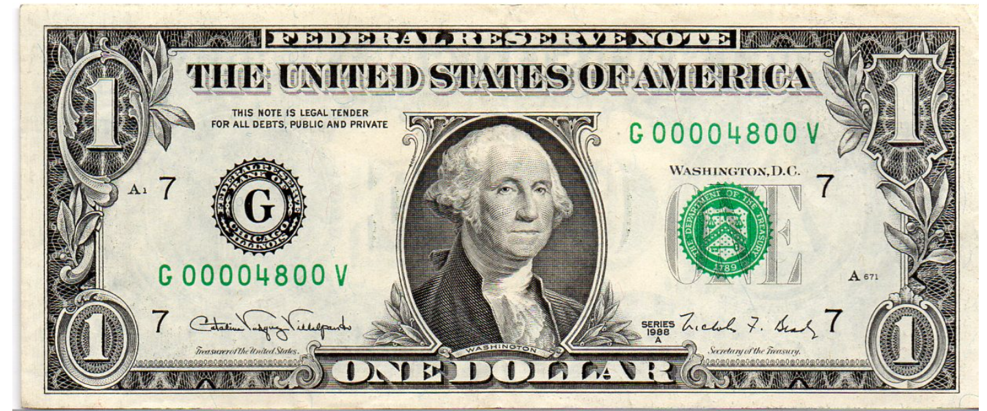 1 Dólar, series 1988A (A-L), P-480b, EXTRA FINO (XF), Villalpando & Brady, número bajo 4800.